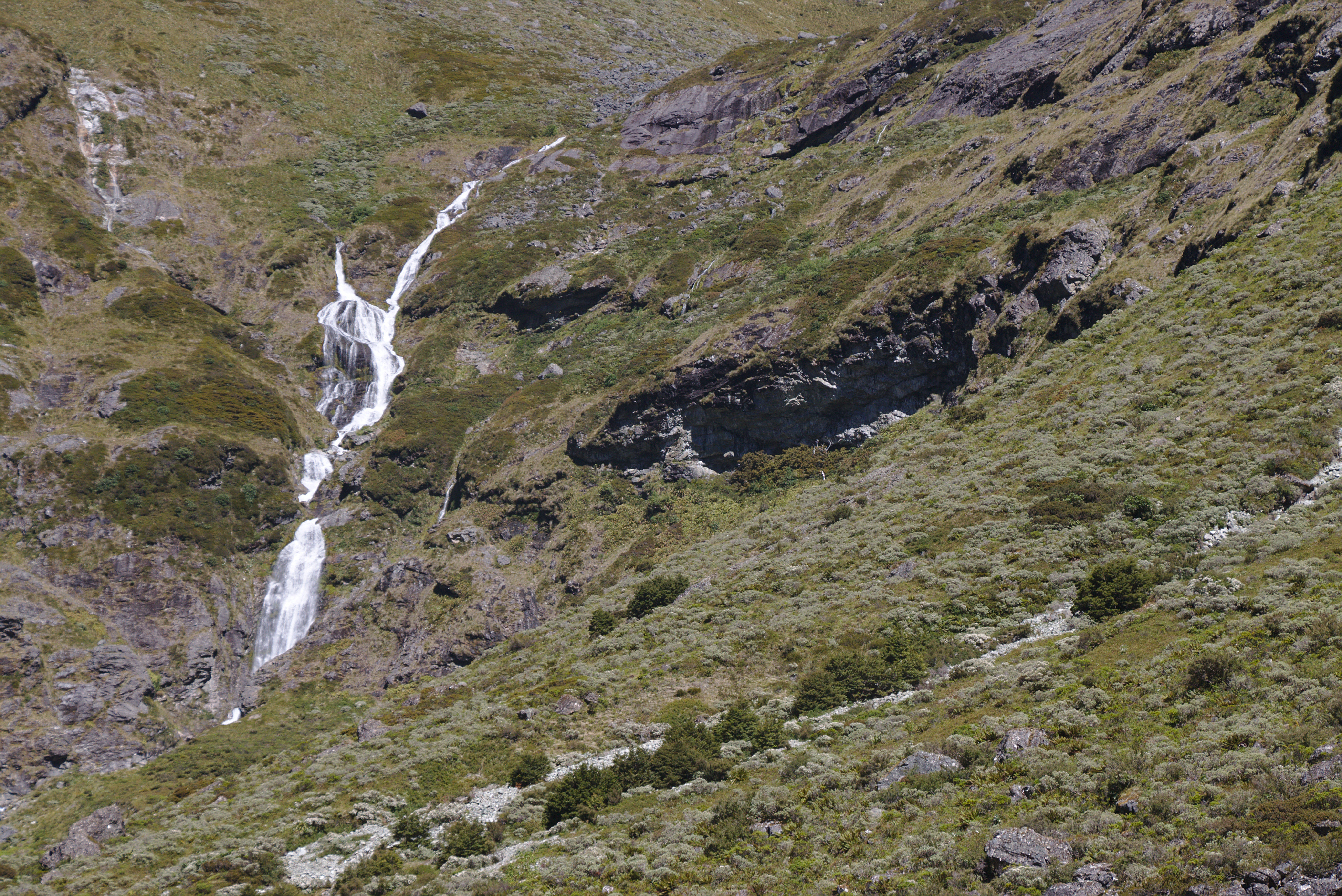 Final climb before reaching the basin. We found a route up to the right and over the overhang. Towards the top we found a small waterfall (not visible in the photo) which we could follow up the side of