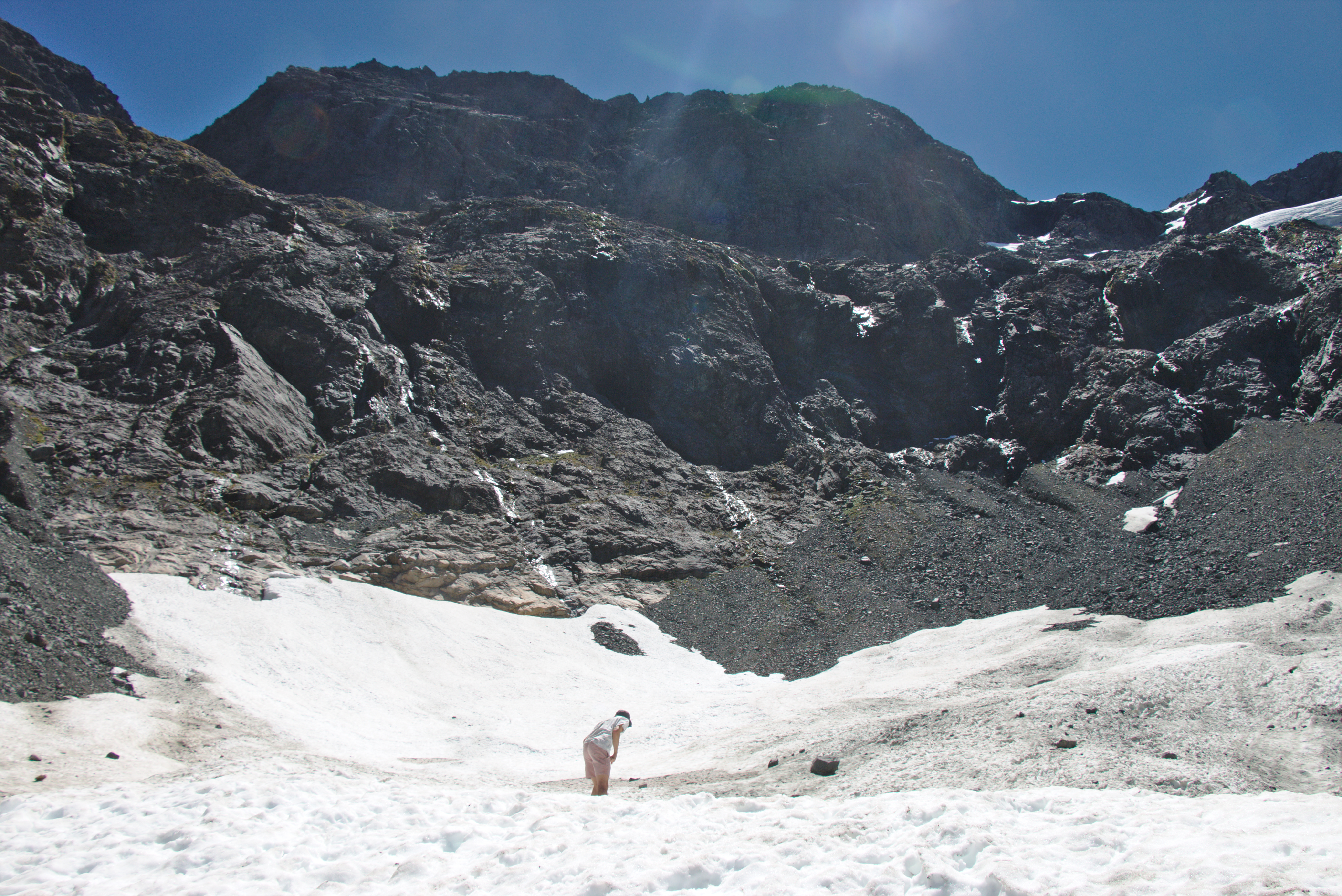 Trying to be brave while dropping down from U-pass towards Hut creek, with Glade pass in the background