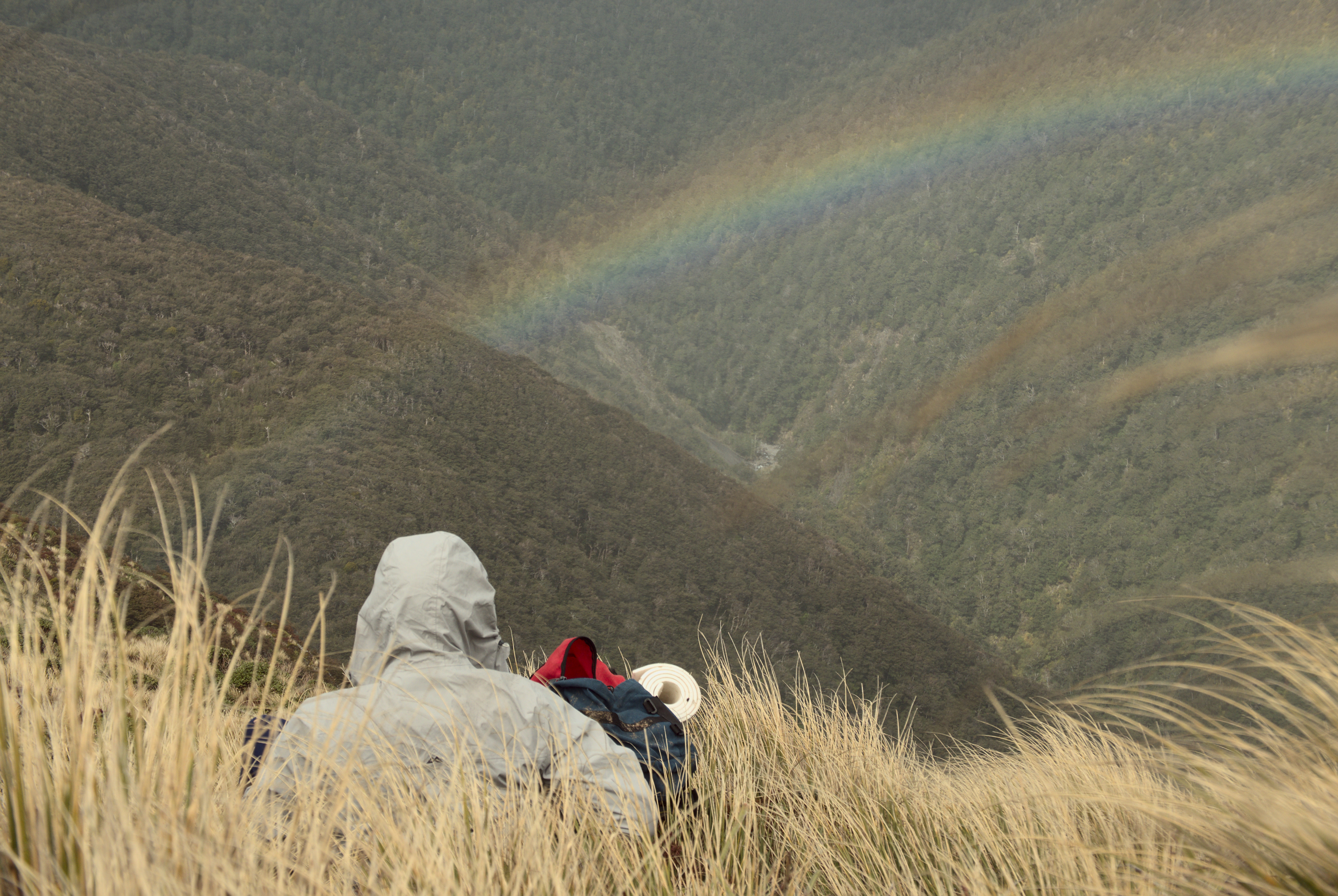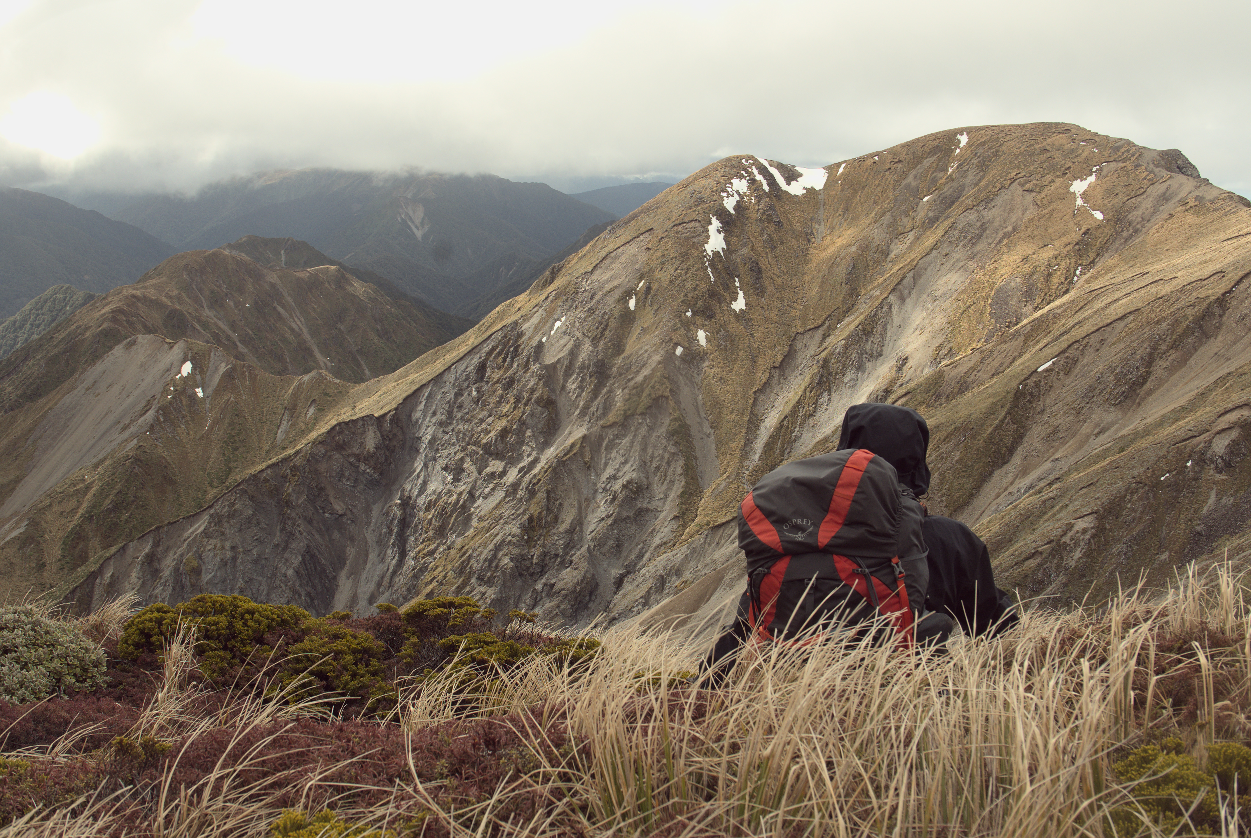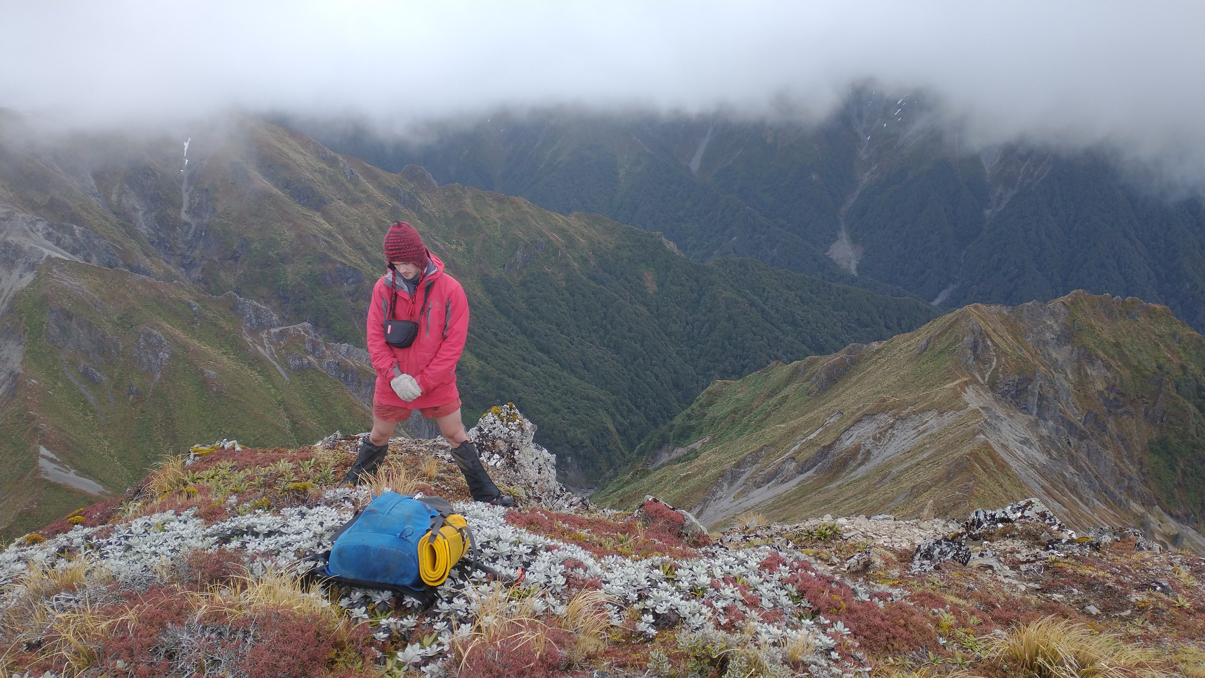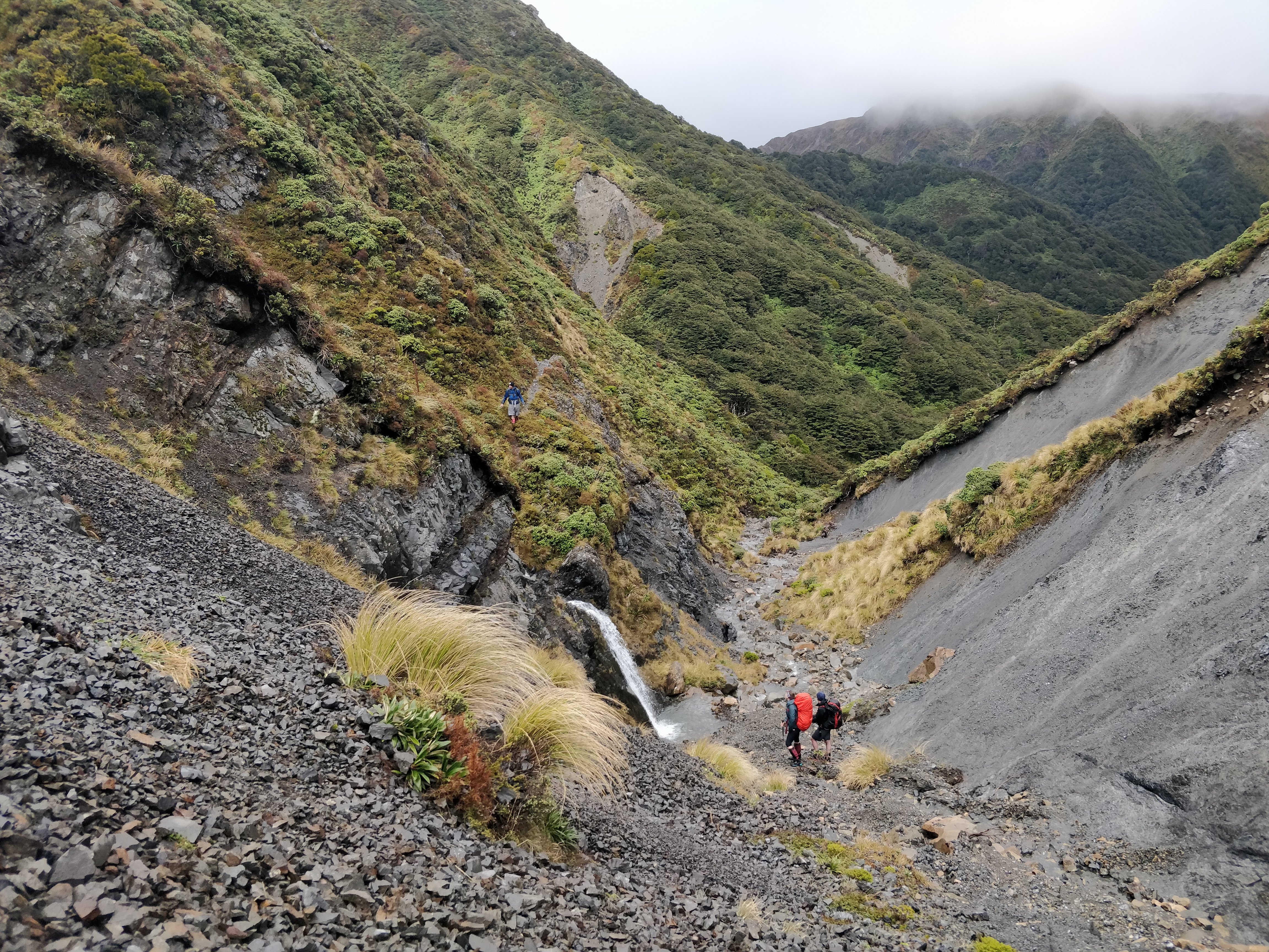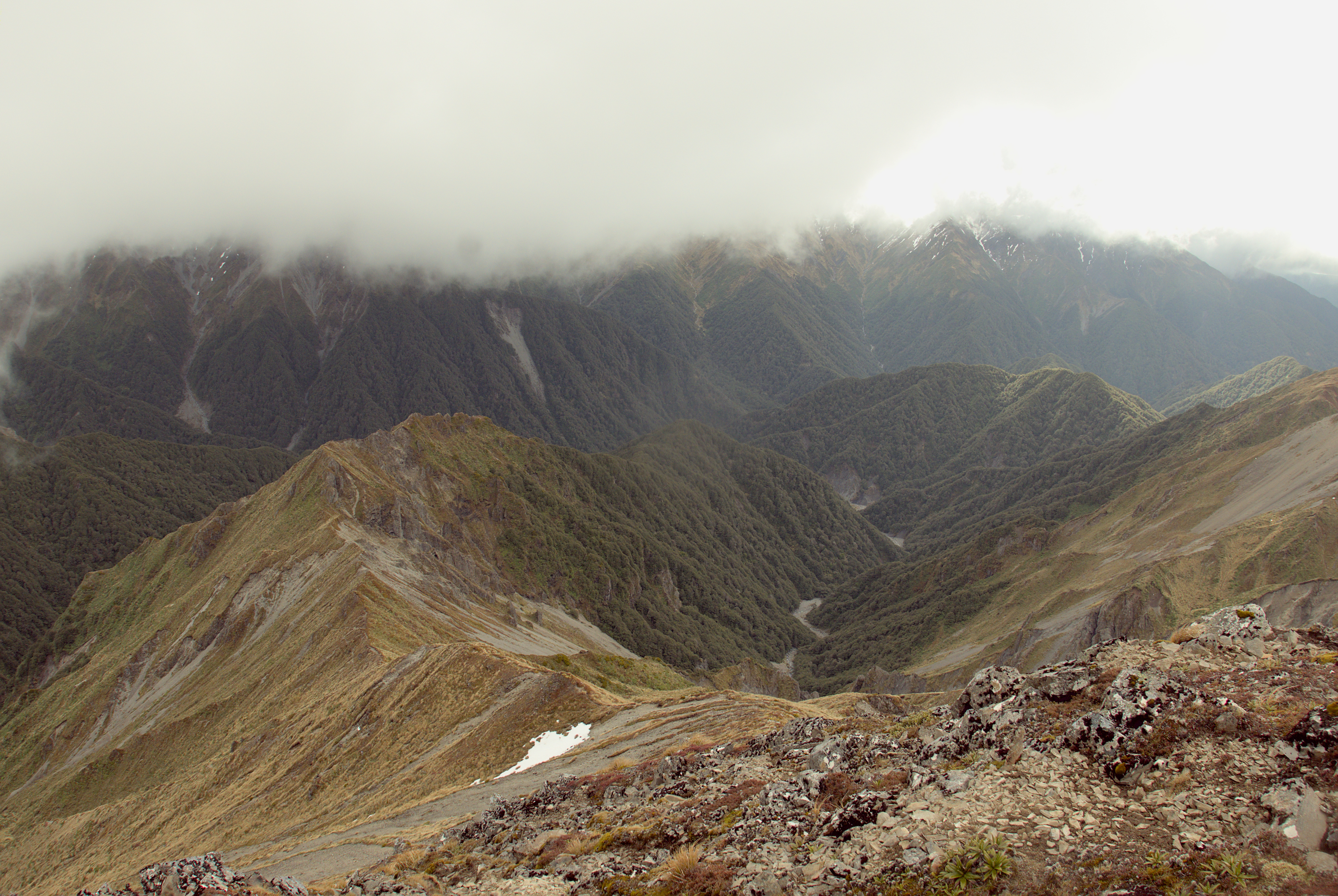 Another WTMC trip, and my first excursion into the Ruahines. While the weather kept hinting at turning bad, and the wind almost made us turn back, we mostly stayed dry. The original intention was to follow the ridge down from pt1715, before dropping down to Waterfall Hut, but we discovered a scree slope that looked quicker (and significantly more fun).
