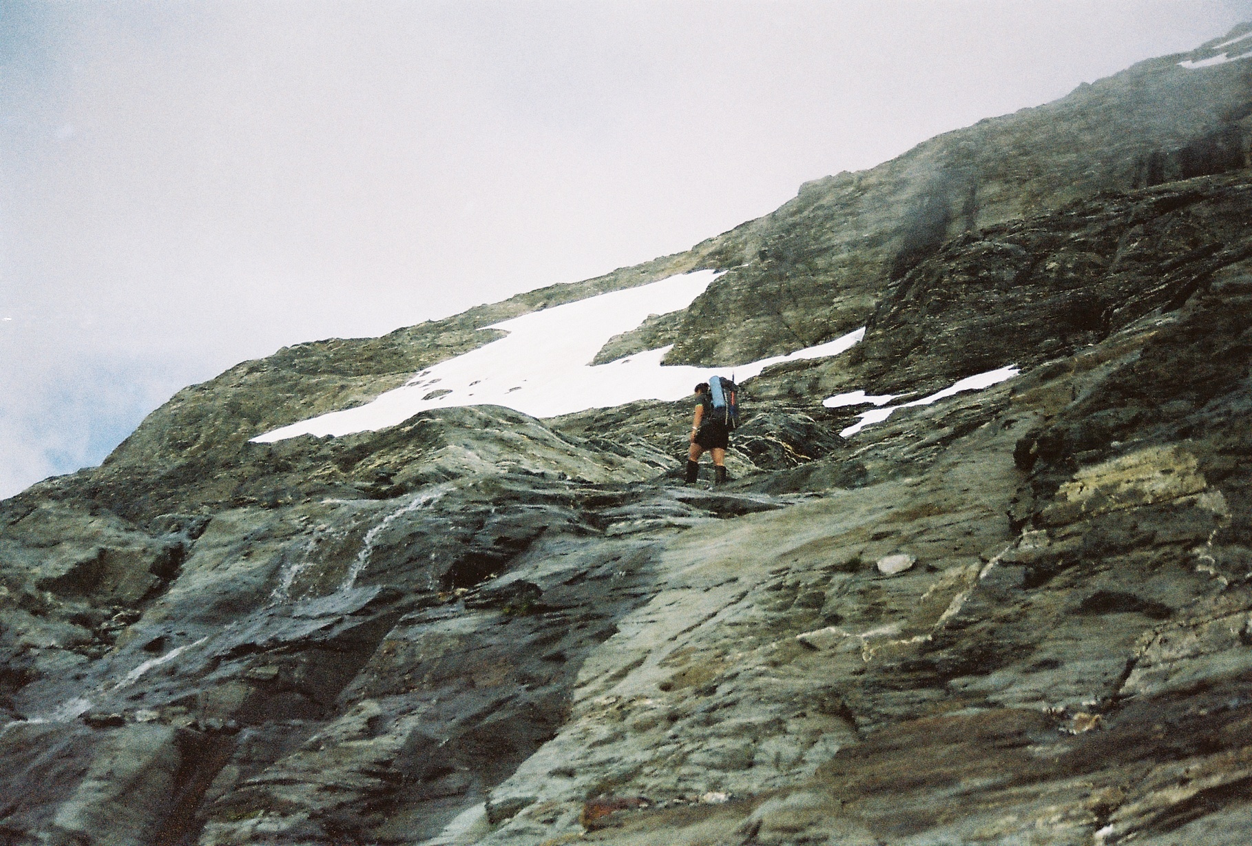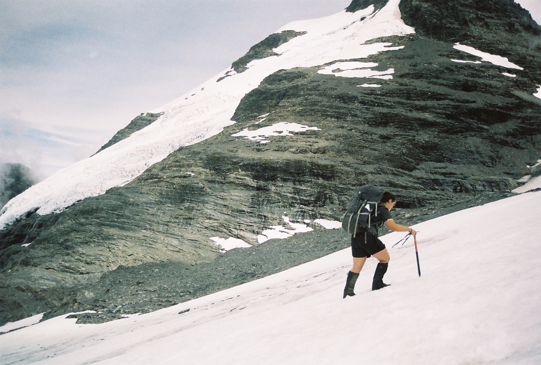A good track continues up to the rock bivvy above the hut, and along the side of Kea Basin. We lost it for a bit when beginning to climb, but found it again on the spur. The rest of the way is relatively well marked by cairns. We stopped for lunch at a small tarn by pt 1445, where someone had obviously been camping recently. Pushing on, the terrain changed to loose rock around 1600m, and good, grippy rock around 100m above that. I lost the cairns multiple times, but Anna was excellent at finding them, and I got the feeling that any route would take you in pretty much the right direction. At the Birley glacier we could follow the footsteps of people before us, although it was still still farily dodgy. About halfway across we thought we were on a small scetion of terra firma, but it turned out to be rocks on top of the glacier. After the glacier there was a small climb up some snow to Wright col, and then an excellent view of Pluto peak and Esquilant Bivvy hut.