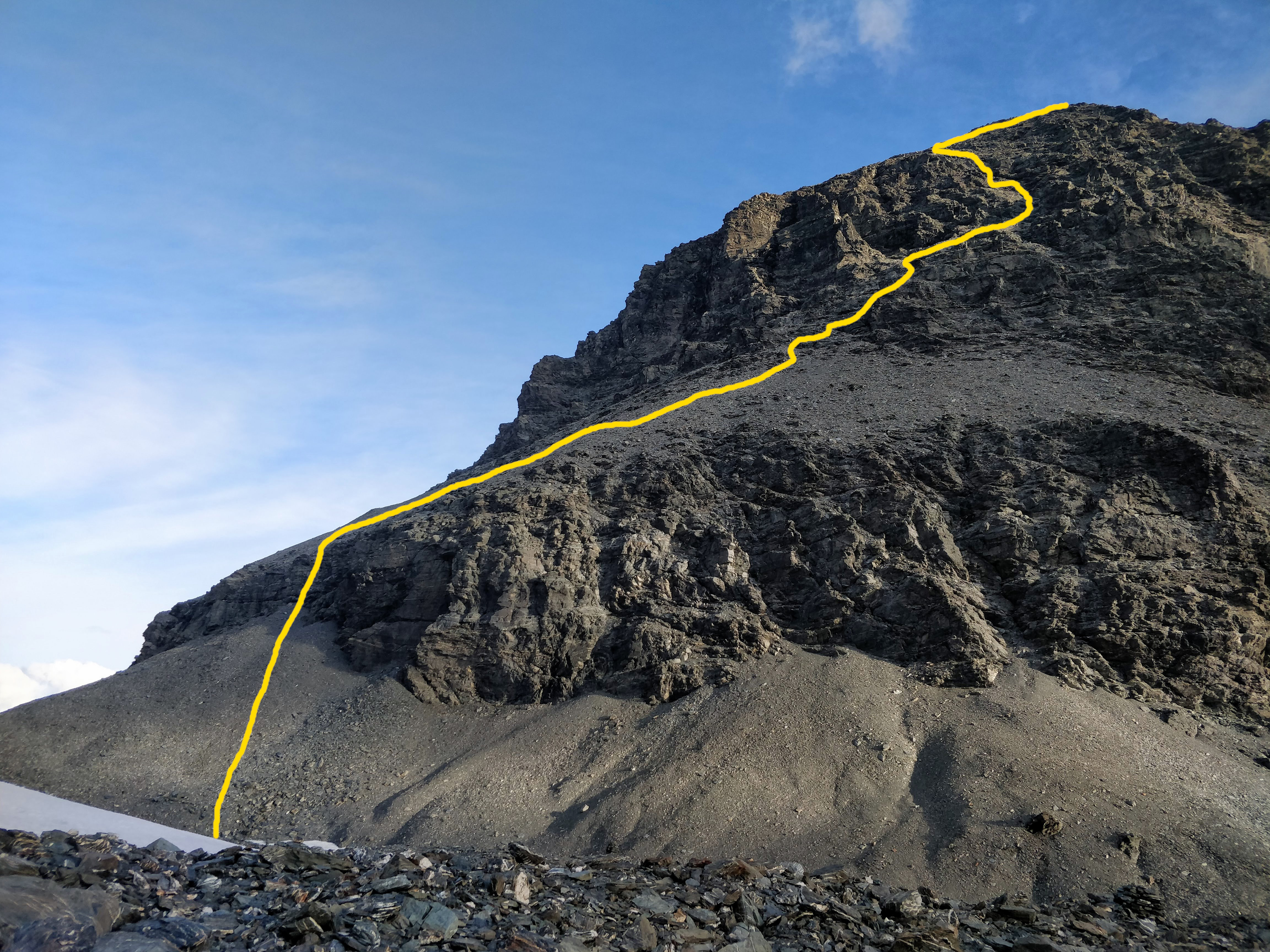 View from Esquilant Bivvy Hut of our approximate route up the final 600m to the summit of East Peak