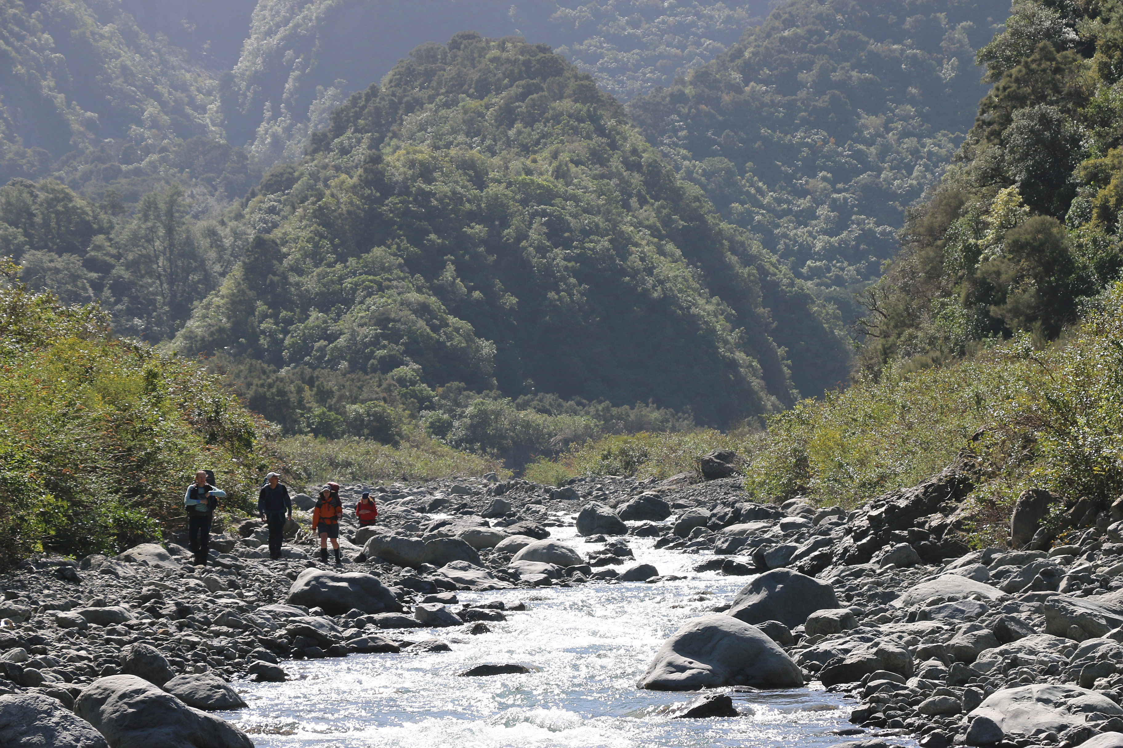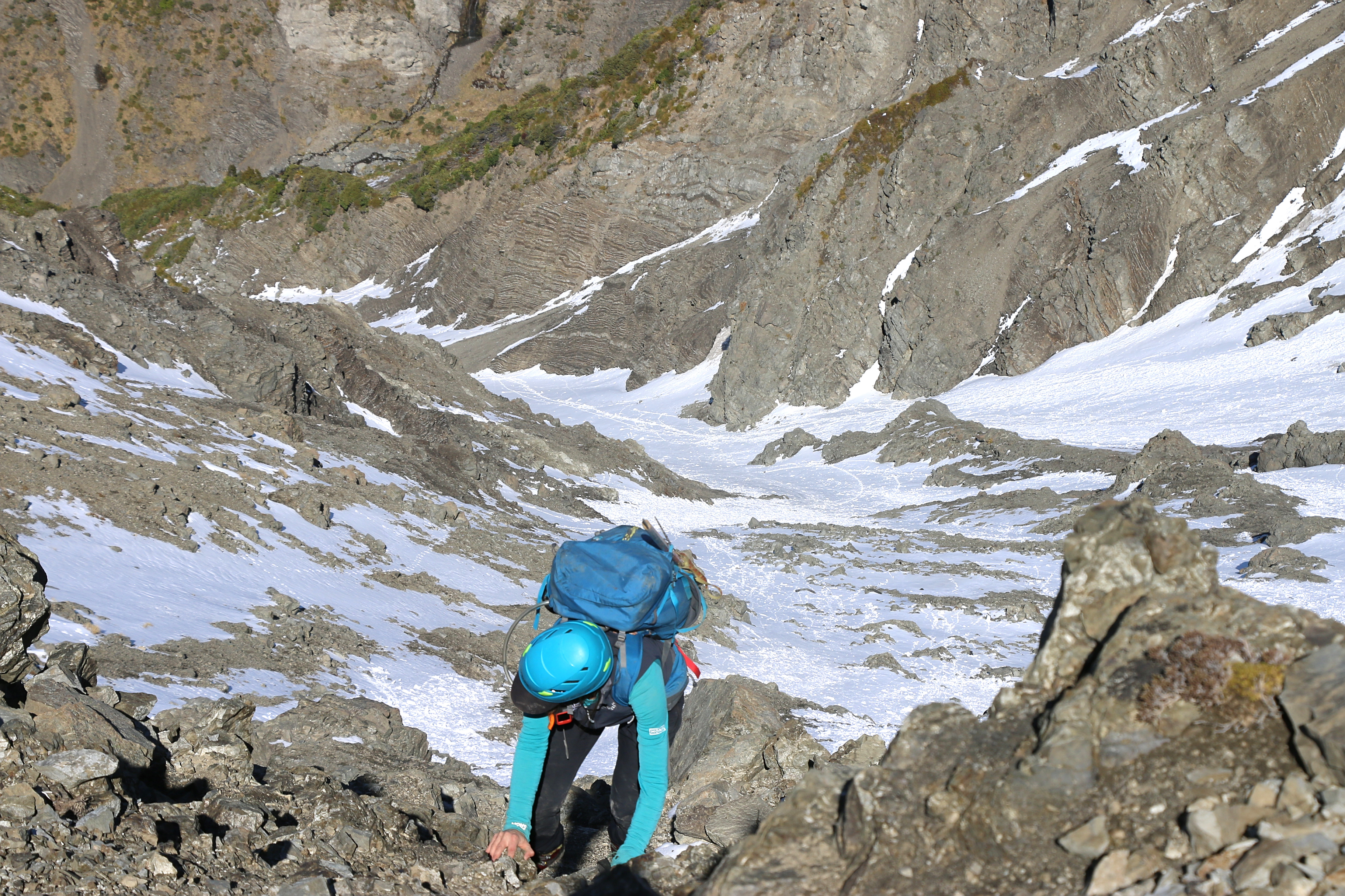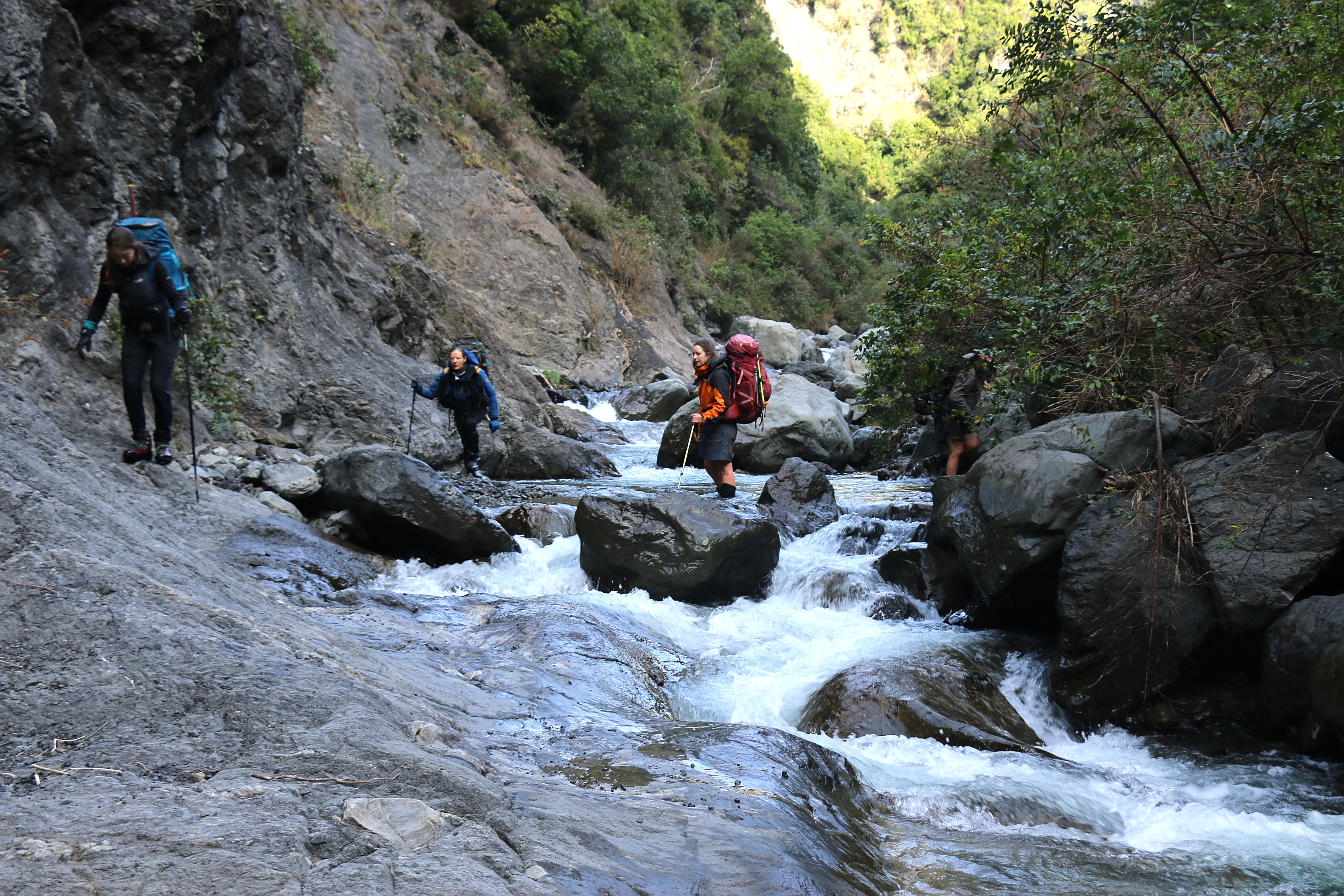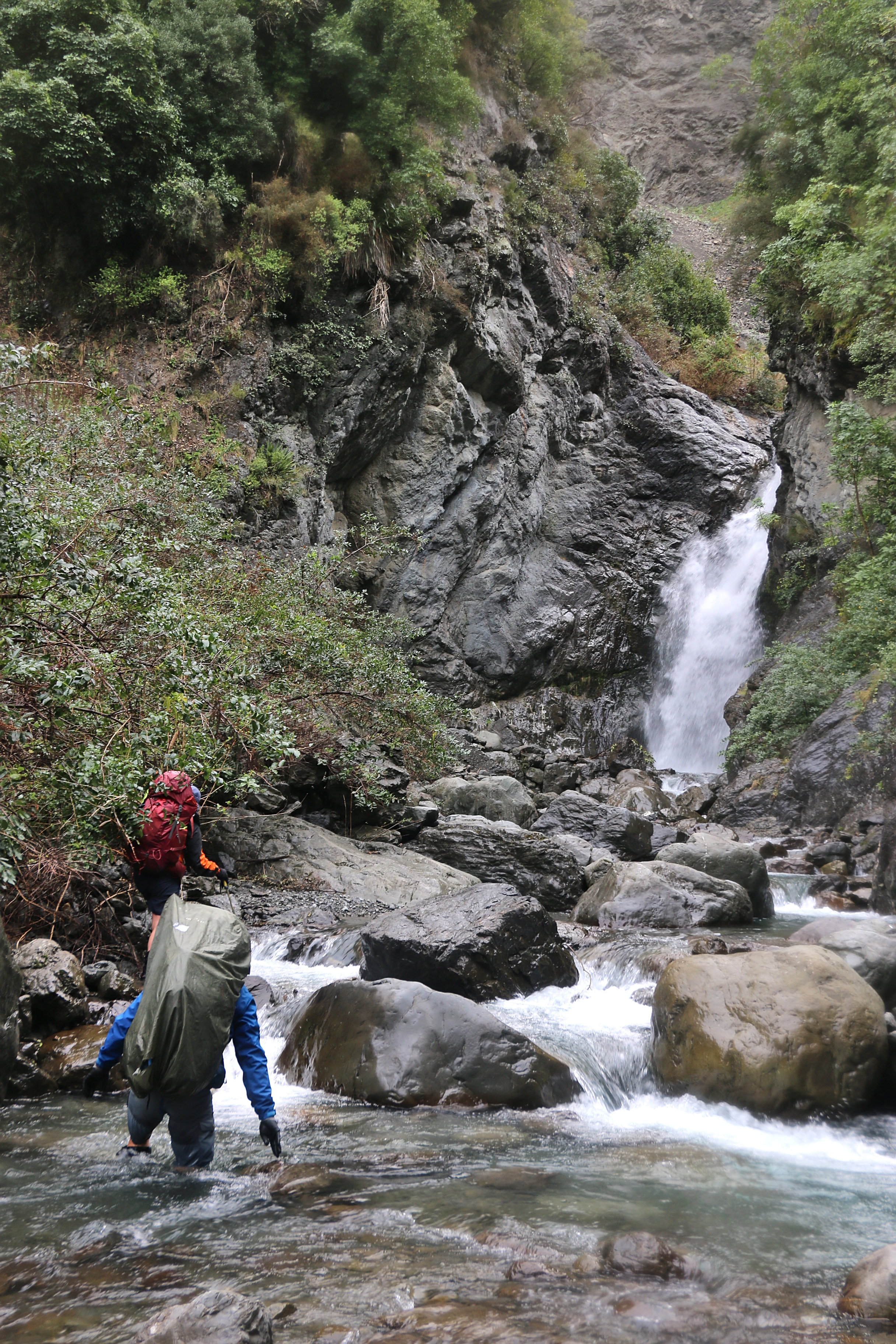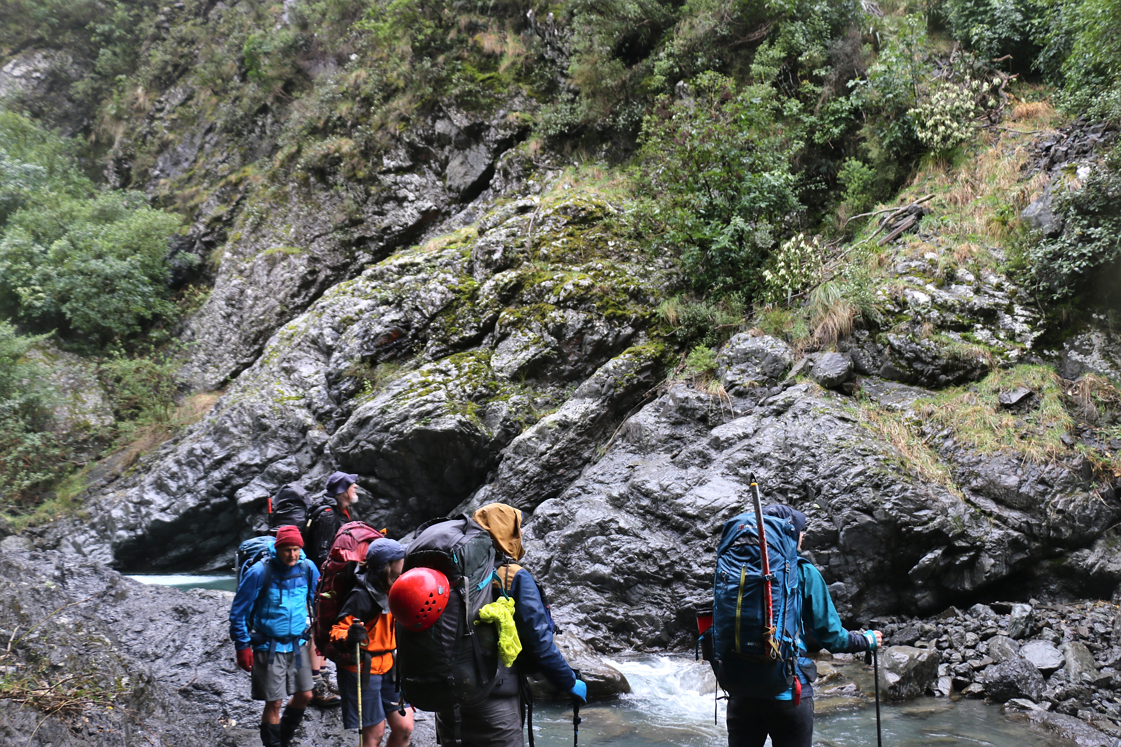 We began heading up Snowflake stream by pushing through scrub, but quickly realised that river travel was easier. The next couple of hours involved a lot of crossing the stream back and forwards. Around 900m upstream we reached a somewhat difficult part, but managed to follow a much smaller side stream up the true right instead. The weather had packed in a bit, but it cleared up nicely as we came around the first big corner. Then began raining again. From this point on, the river became a bit gorgey, but we were making steady progress until we reached the first waterfall. This one is about 20m tall. There is a very obvious slip to head up just before it. We climbed about 40m before pushing through the bush to come out on the other side of the waterfall. The terrain on the other side was steep but doable, although a party of 7 always becomes slow in these areas.