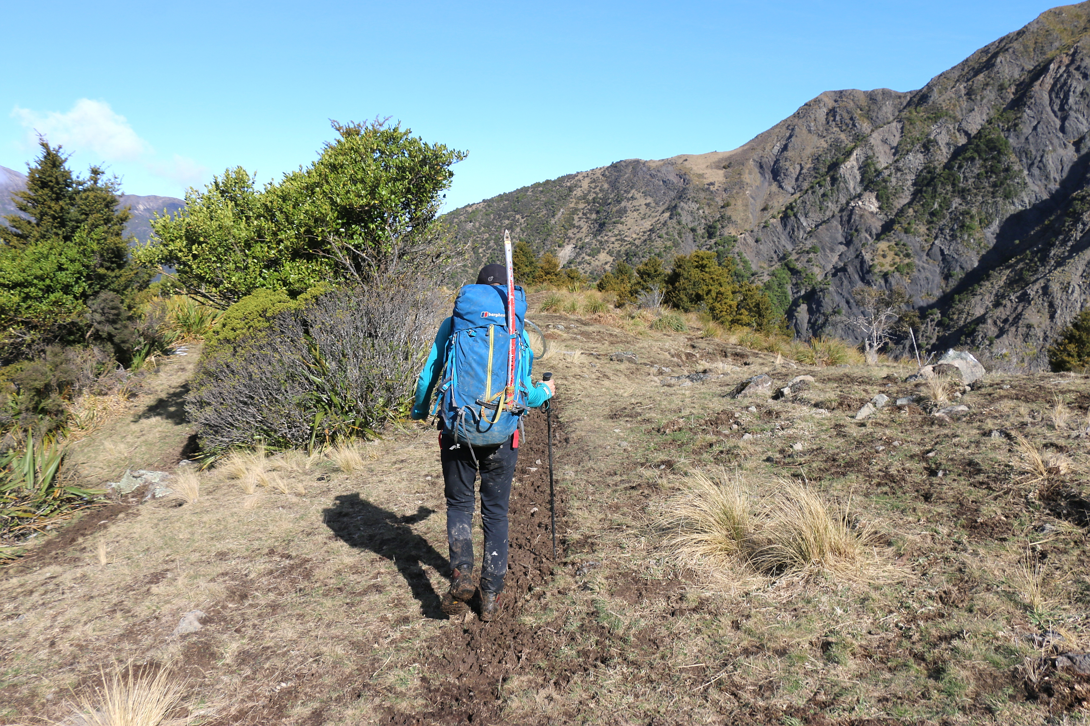 We began the day with a 5am alarm, but didn’t start heading up the spur directly behind the campsite until quarter to seven. Progress uphill through the bush was very slow. We initially headed slightly towards the right, but it bluffed out to a fairly active looking slip. There is a fairly nice looking grassy patch which climbs about 100m, but in practice it is too steep and slippery to go up, so we remained in the bush. After a couple of hours (and less than 300m from the campsite horizontally) we came out at a clearing. This wasn’t quite the end of the steep climb, but for the remainder we could follow a well worn goat track.