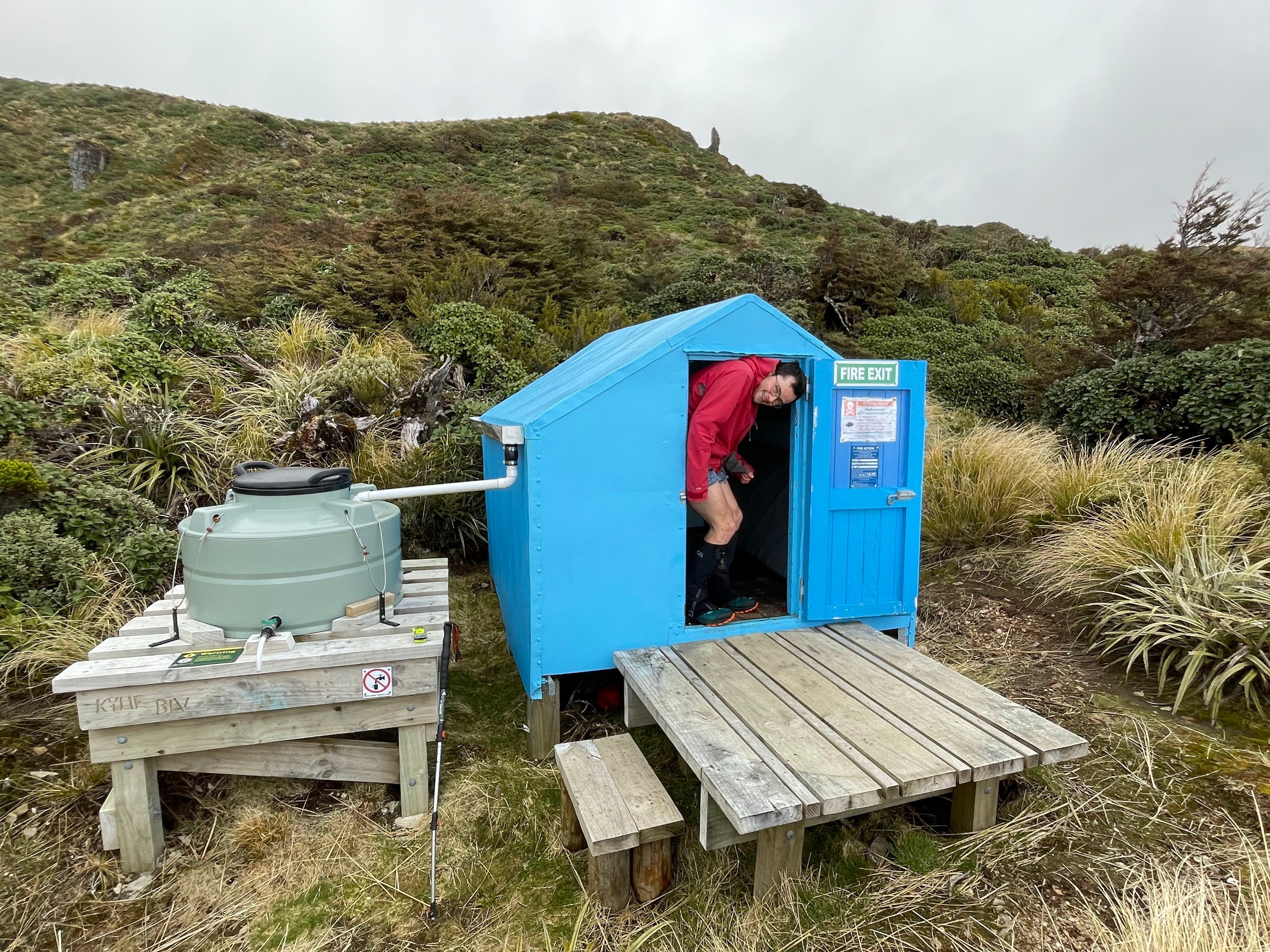 At this point Peter and Brett headed down the spur to Upper Makaroro Hut, while Emily and Mathew popped over to bag Kylie Biv – suffering only a small amount of brain freeze in the wind to do so. Kylie Biv is bright blue, in excellent condition, and is a great place for taking photos in the doorway if you want to look like a giant.