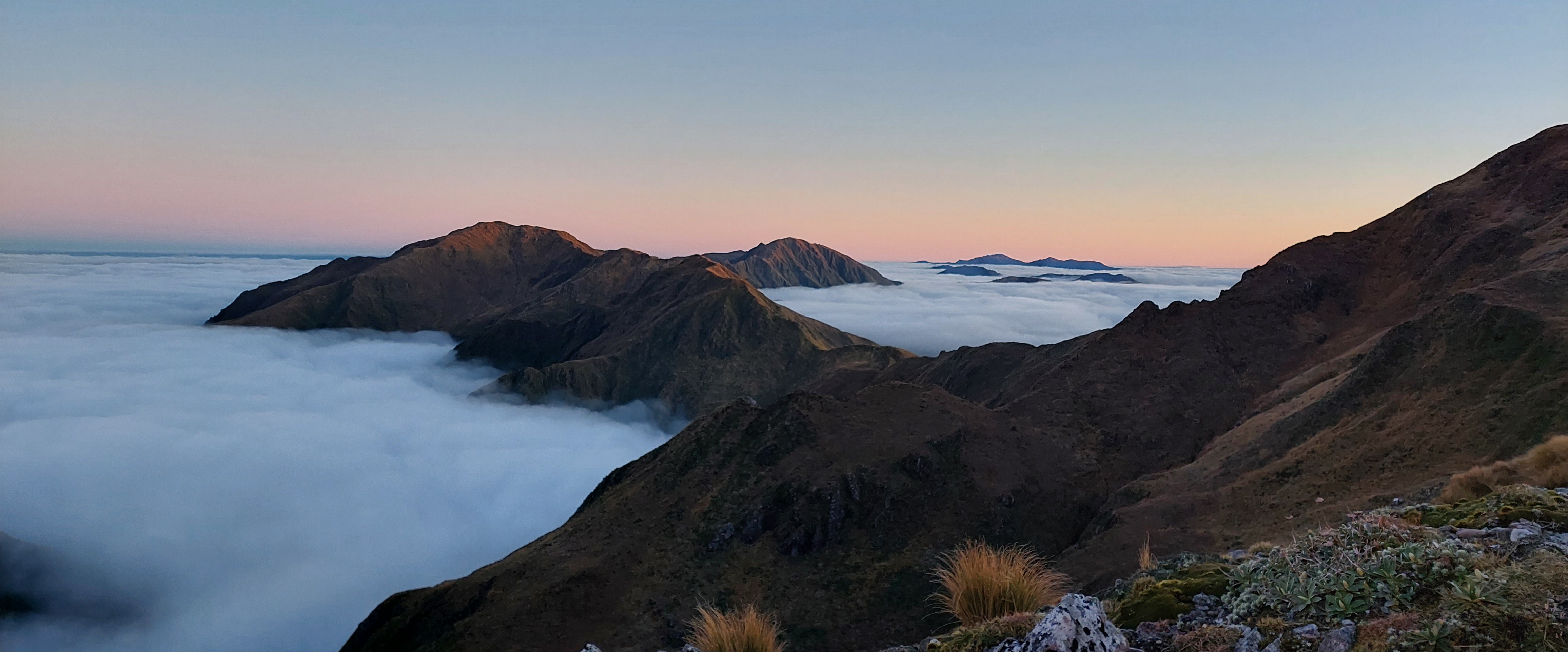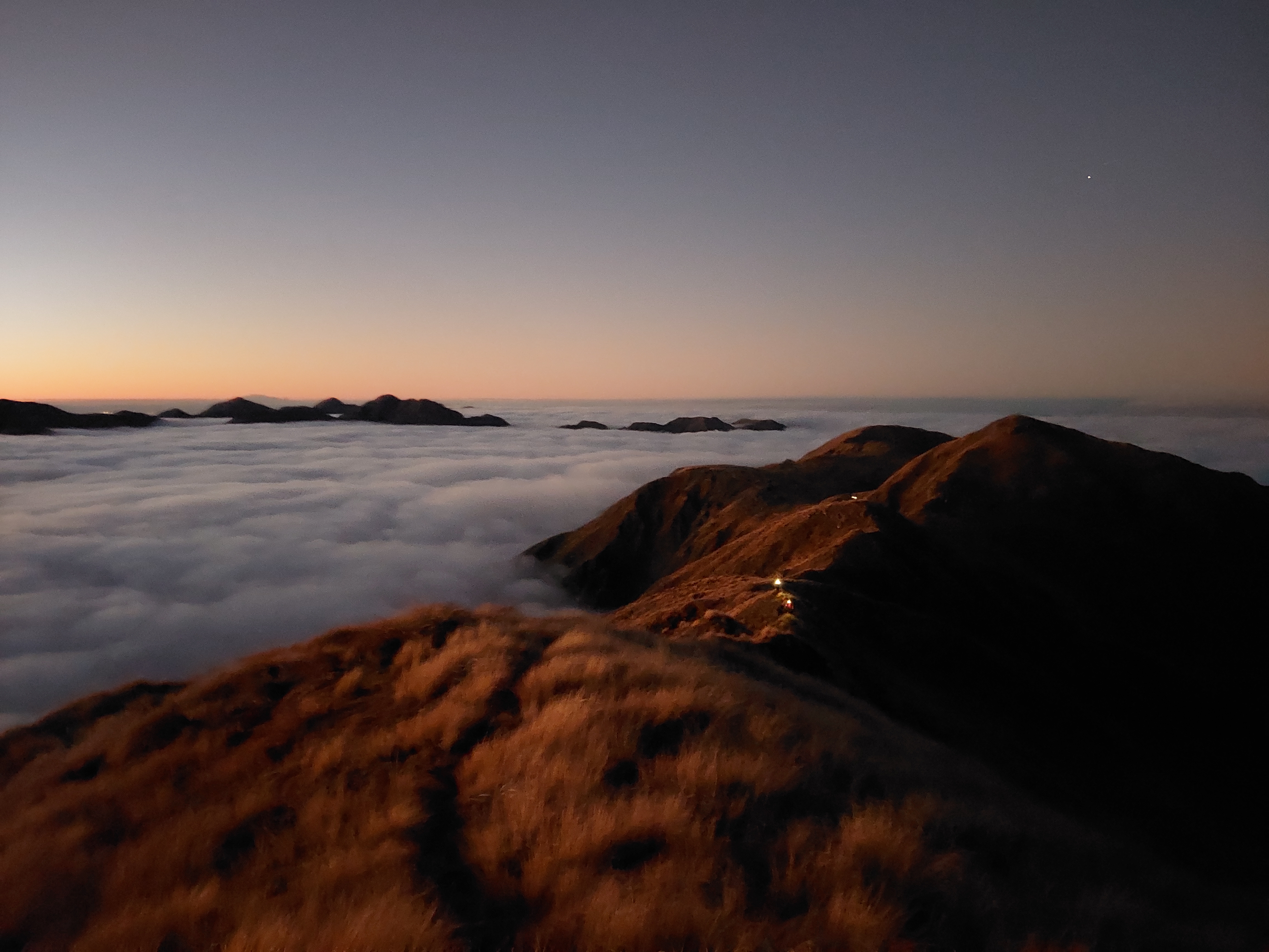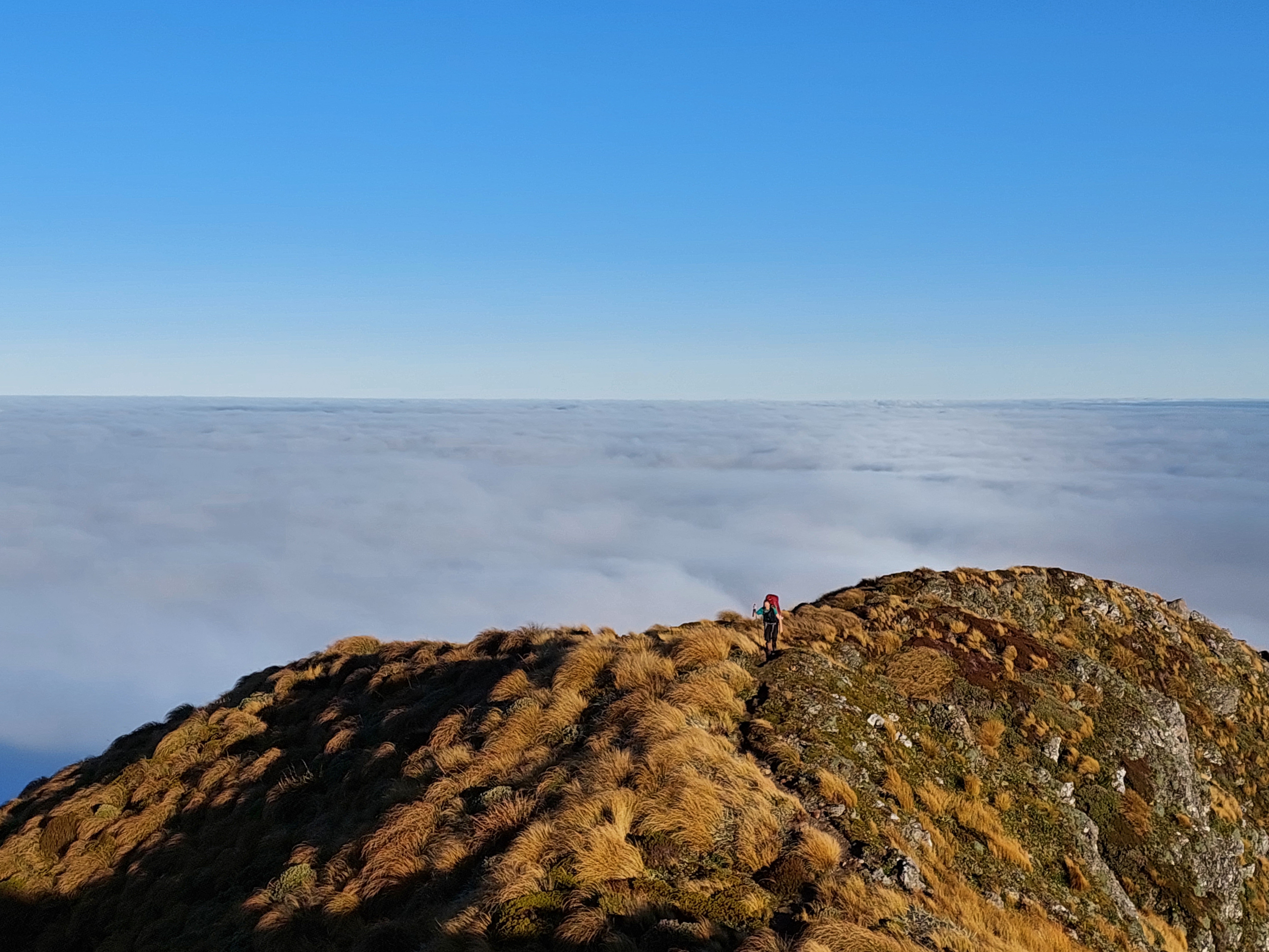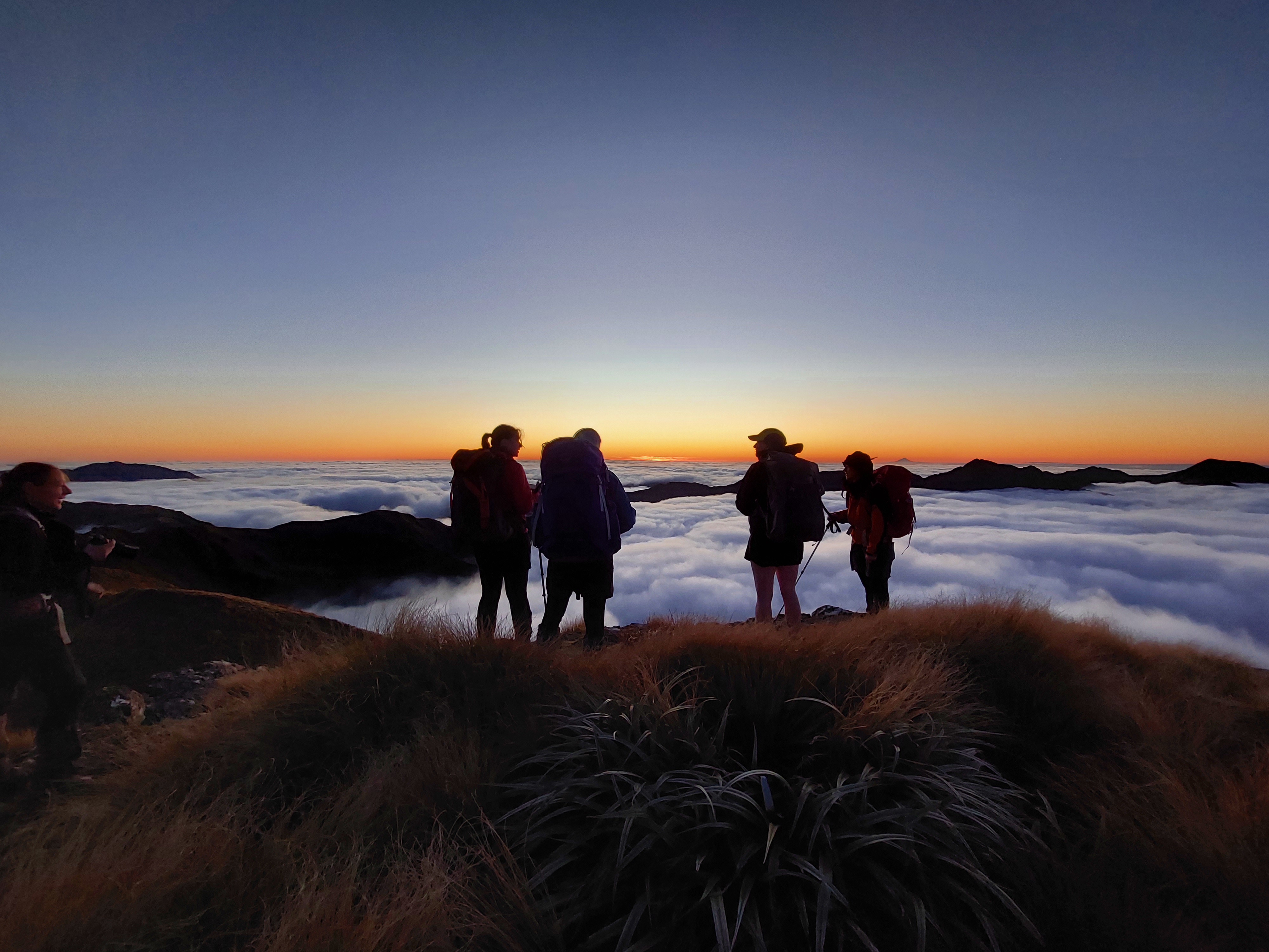 Trusting the forecast, I was expecting to be walking in rain all weekend, so when it looked like we would actually just be walking in clag I was actually pretty happy. Plus, we had got about 50m of views between the bushline and the cloud as we climbed up Mitre. But half an hour later we began to imagine faint shimmers of blue above, and within no time we were looking down on a sea of cloud, with not a breath of wind to ruin it. As we headed over Mitre and Girdlestone we were treated to an absolutely stunning sunset, and views of Taranaki and Ruapehu. By the time we reached Tarn ridge hut the Milky Way was on full show, and I even saw a shooting star. Somehow this had become one of my best Tararua trips. On Sunday we headed out over Adkin and past Mid King Biv.