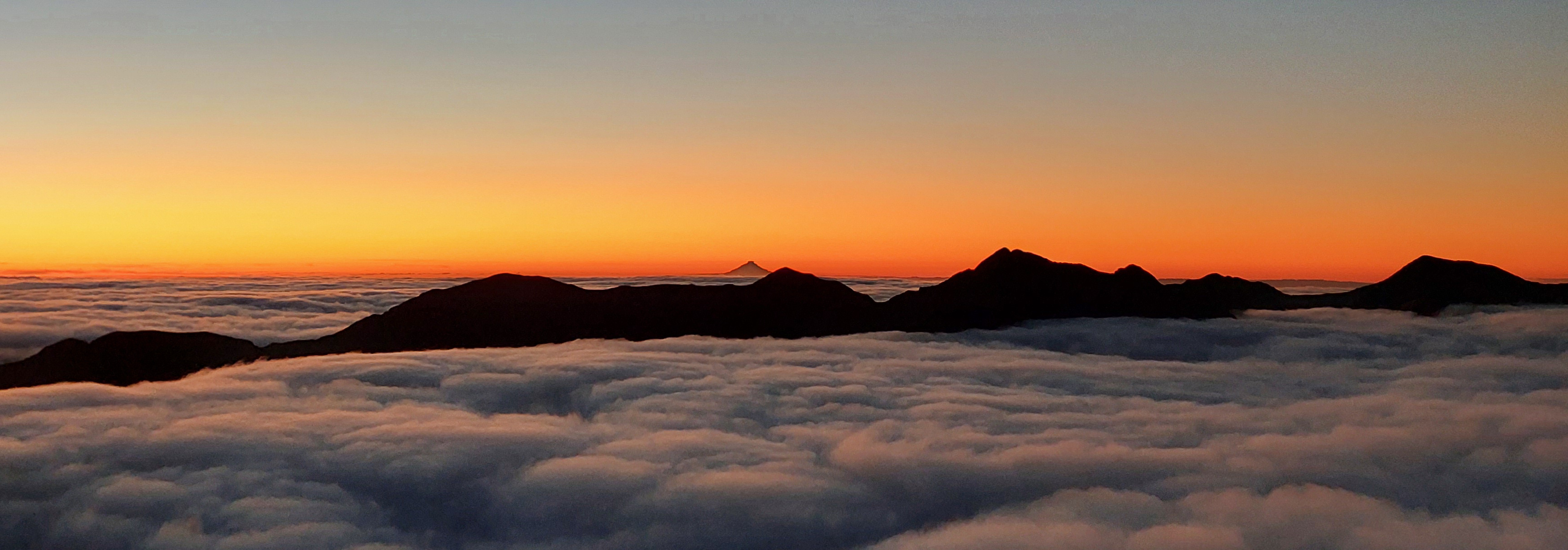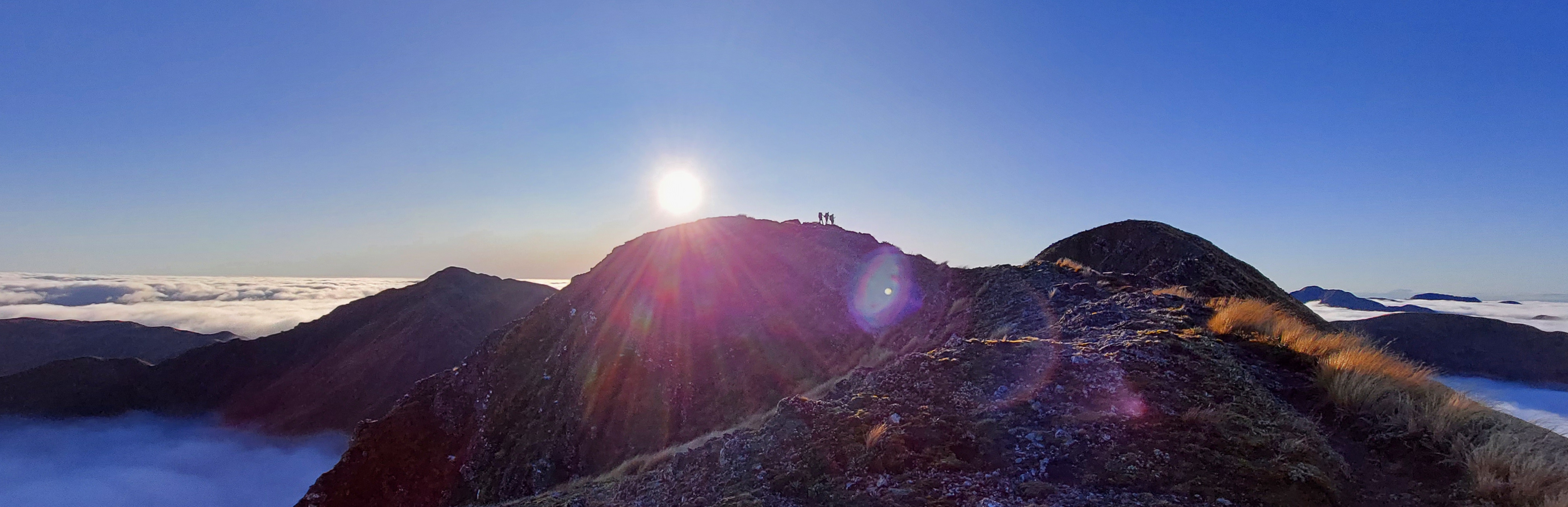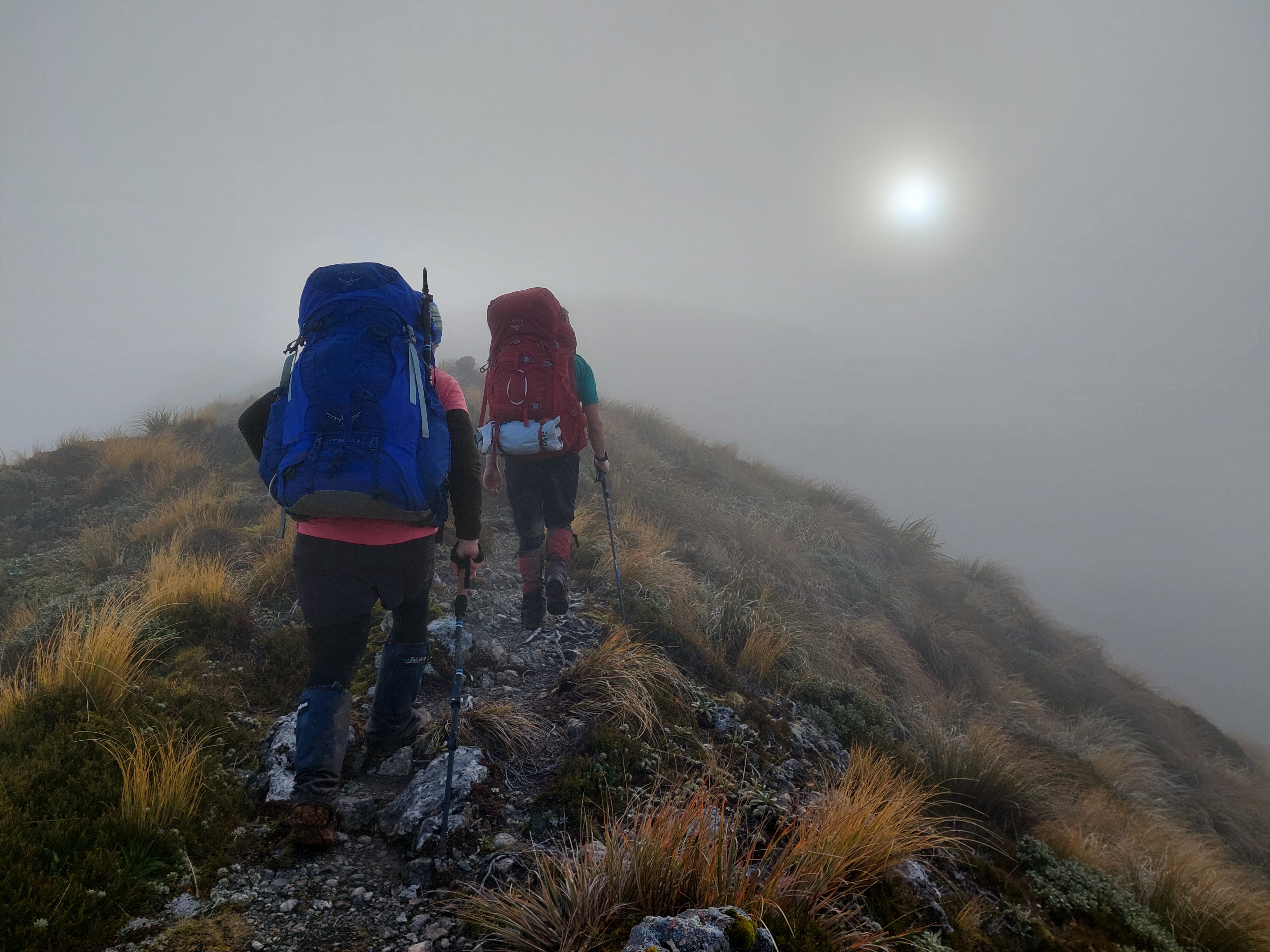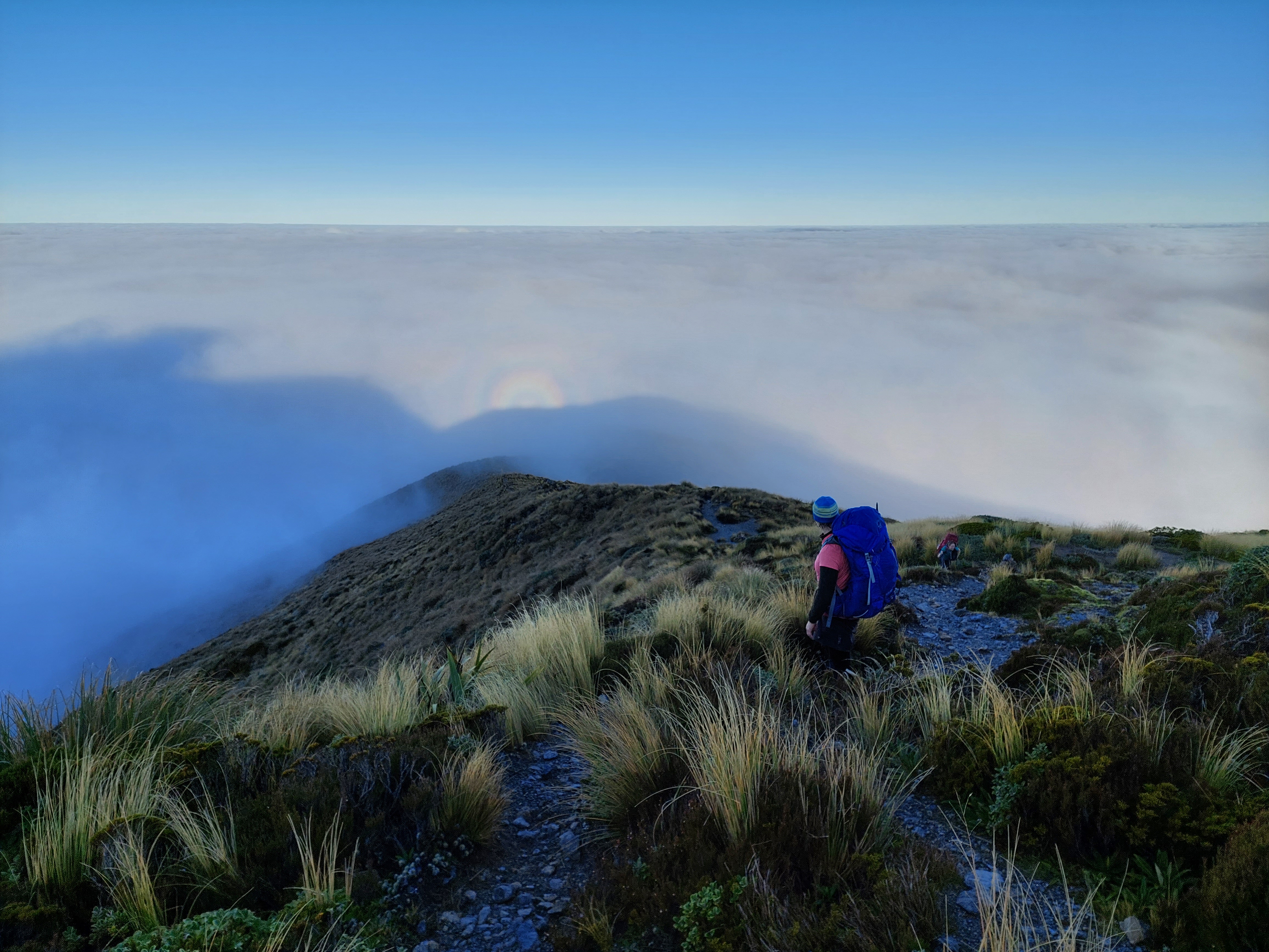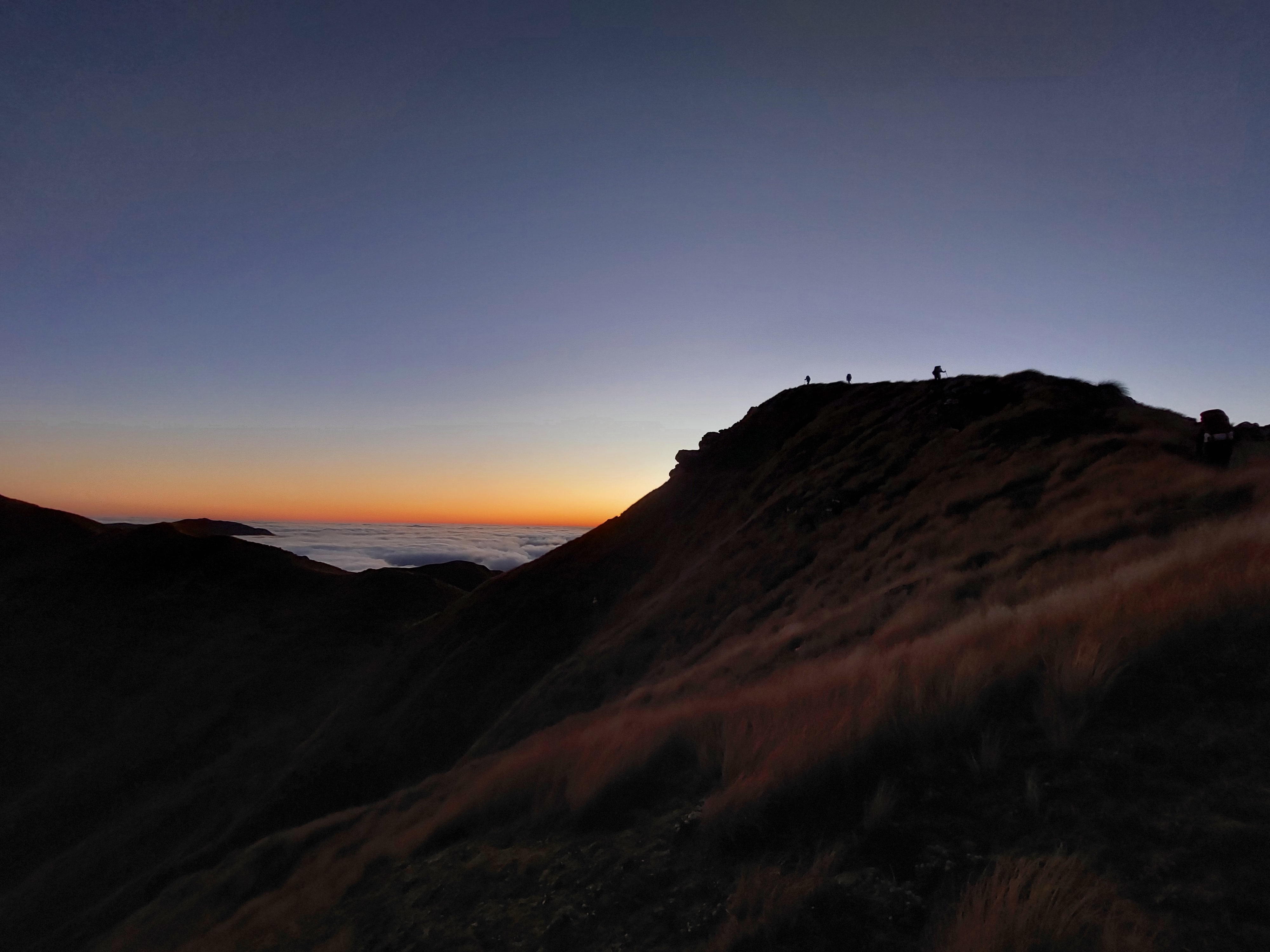 Trusting the forecast, I was expecting to be walking in rain all weekend, so when it looked like we would actually just be walking in clag I was actually pretty happy. Plus, we had got about 50m of views between the bushline and the cloud as we climbed up Mitre. But half an hour later we began to imagine faint shimmers of blue above, and within no time we were looking down on a sea of cloud, with not a breath of wind to ruin it. As we headed over Mitre and Girdlestone we were treated to an absolutely stunning sunset, and views of Taranaki and Ruapehu. By the time we reached Tarn ridge hut the Milky Way was on full show, and I even saw a shooting star. Somehow this had become one of my best Tararua trips. On Sunday we headed out over Adkin and past Mid King Biv.