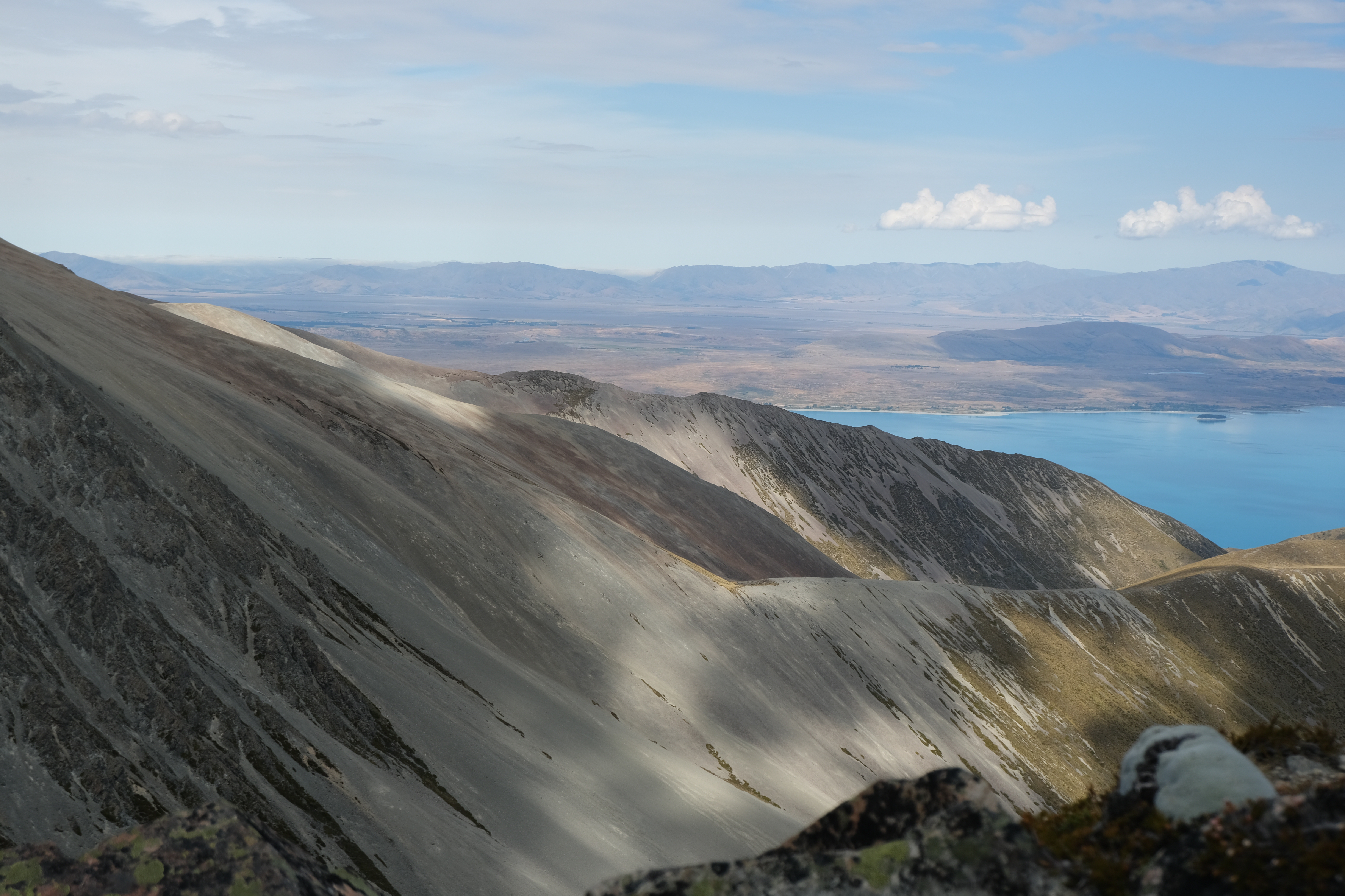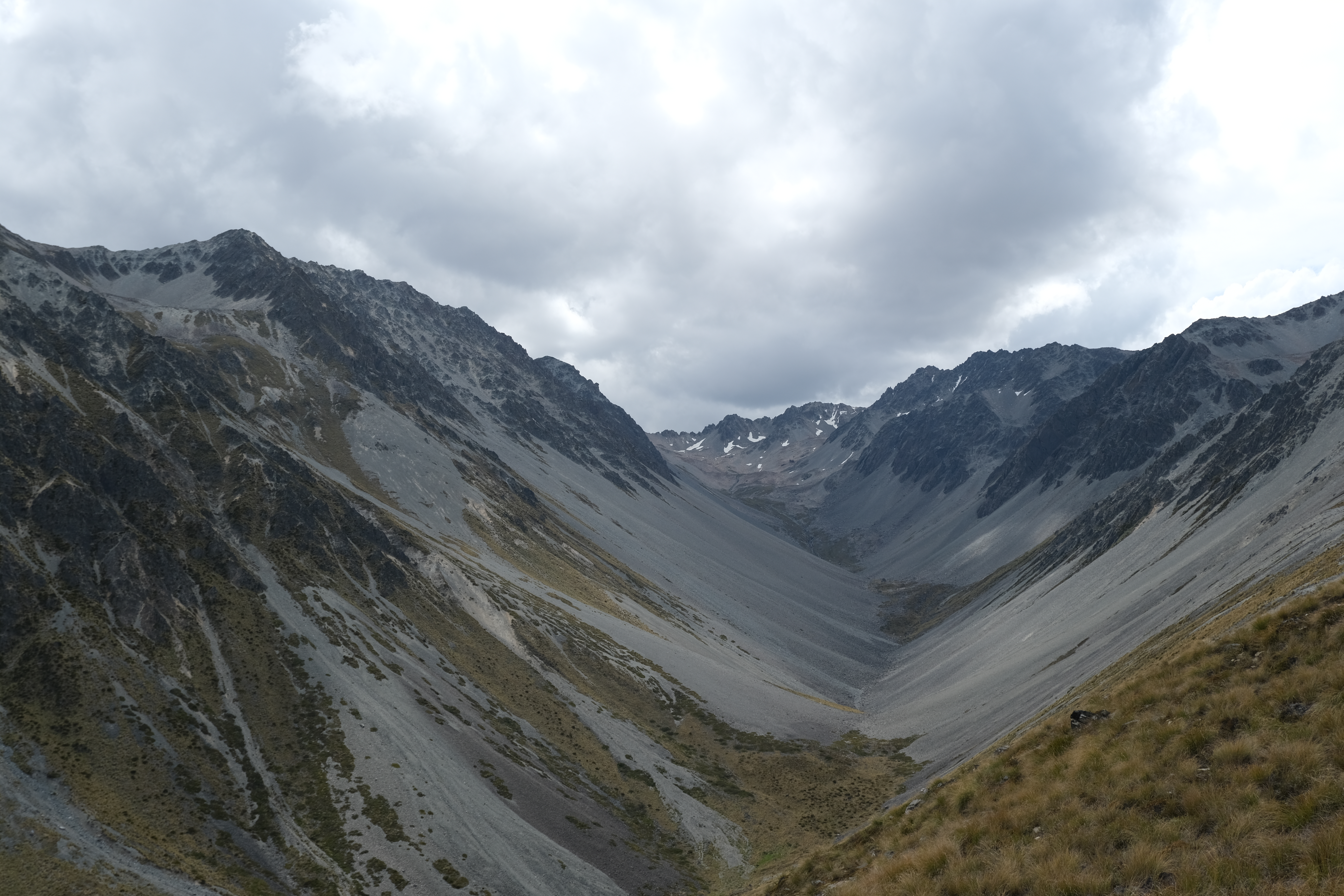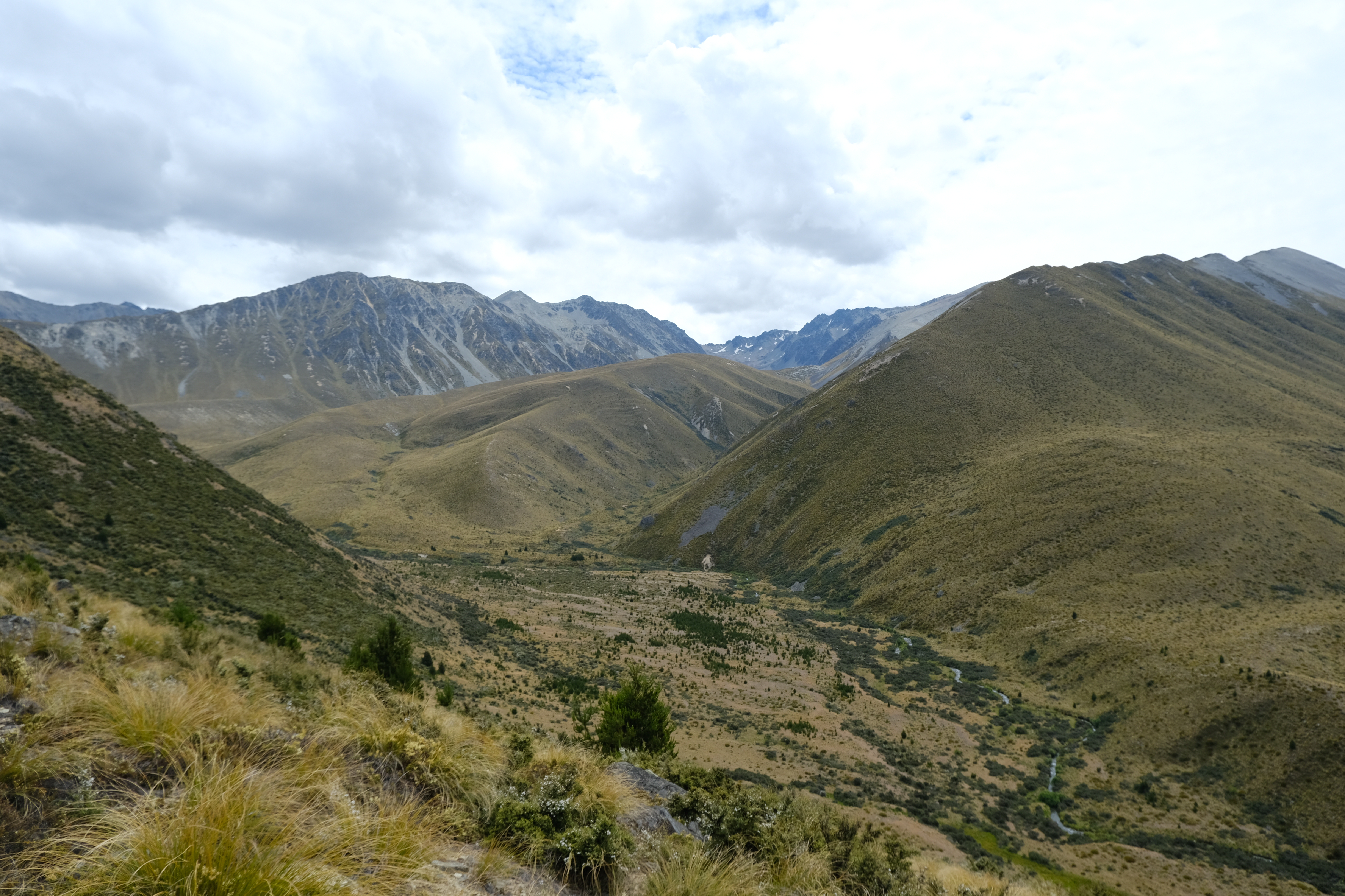 Initially following a GPX file supplied to me by Emily, who had snuck in a few months before me, I headed up an access track on public conservation land by Boundary stream. An initial attempt to head up Disappointment Gully ended in disappointment when I couldn’t get through a particularly gnarly patch of speargrass and matagauri. When I eventually reached scree it was quite hard going, both down and up. I opted to avoid it as much as possible on the climb and scrambled directly up a slightly more stable chossy gully instead, which forunately did lead to the ridge. I was briefly hit by a hail storm heading along to point 2023, but by the time I reached the summit the sun was out and I was sweating again.