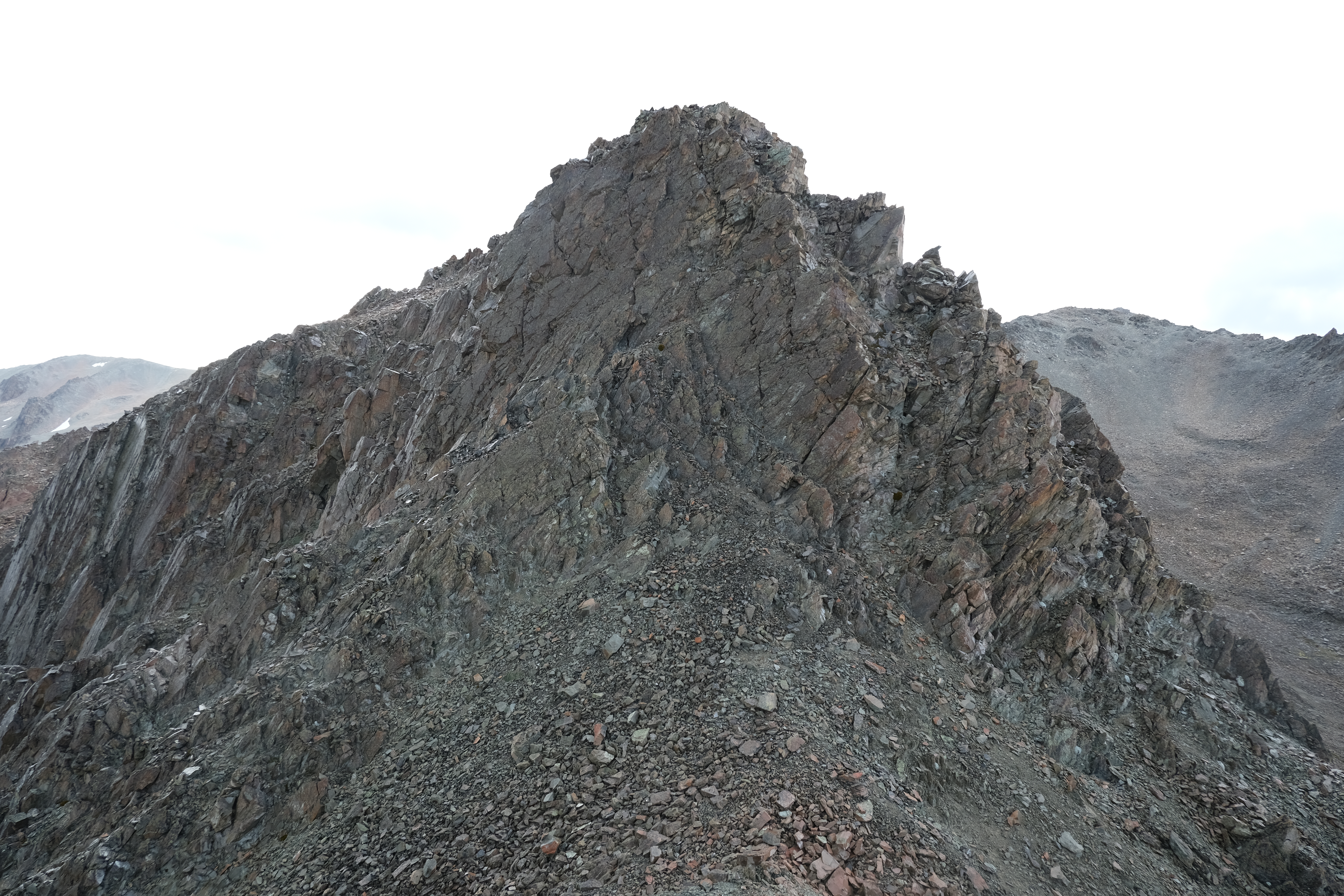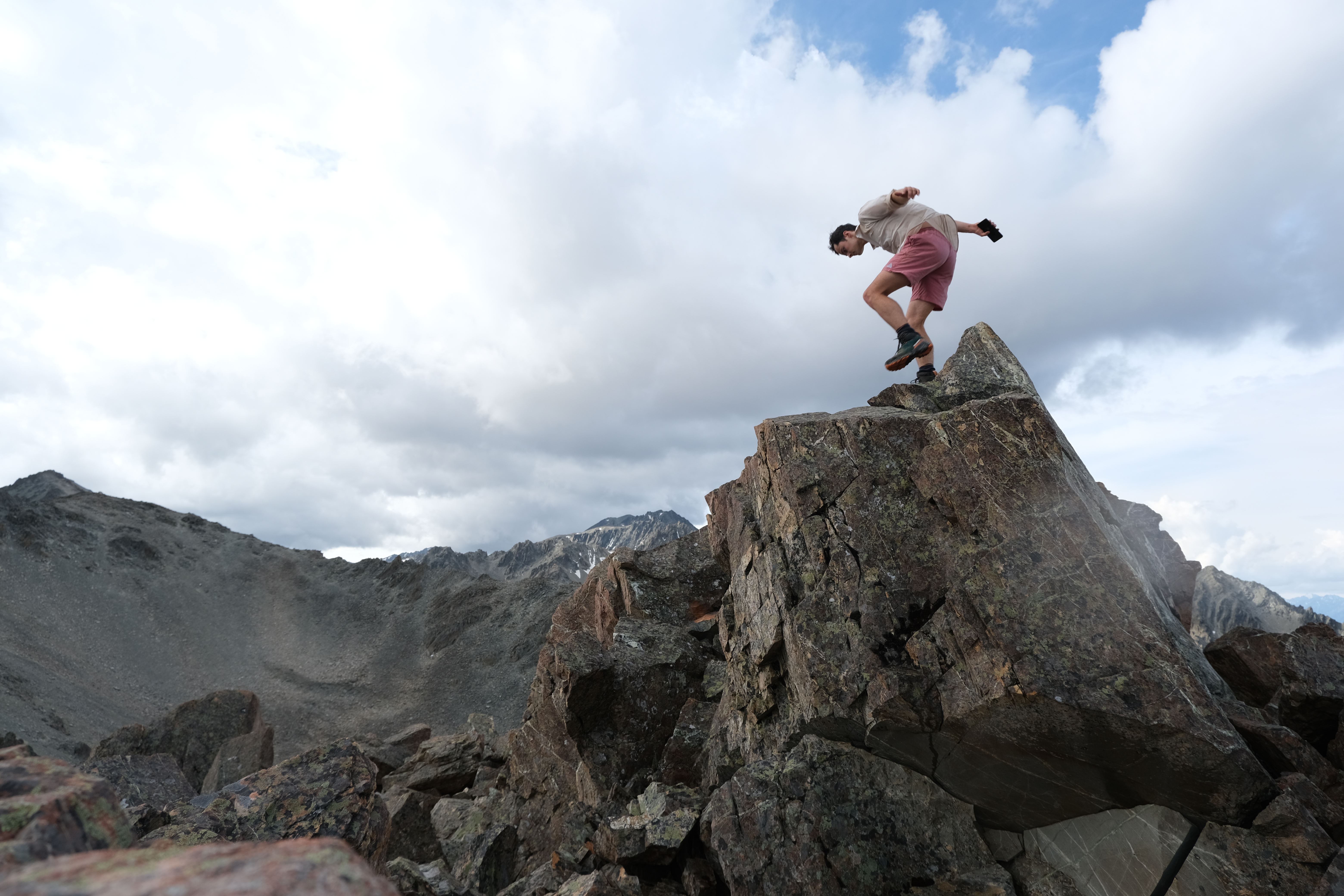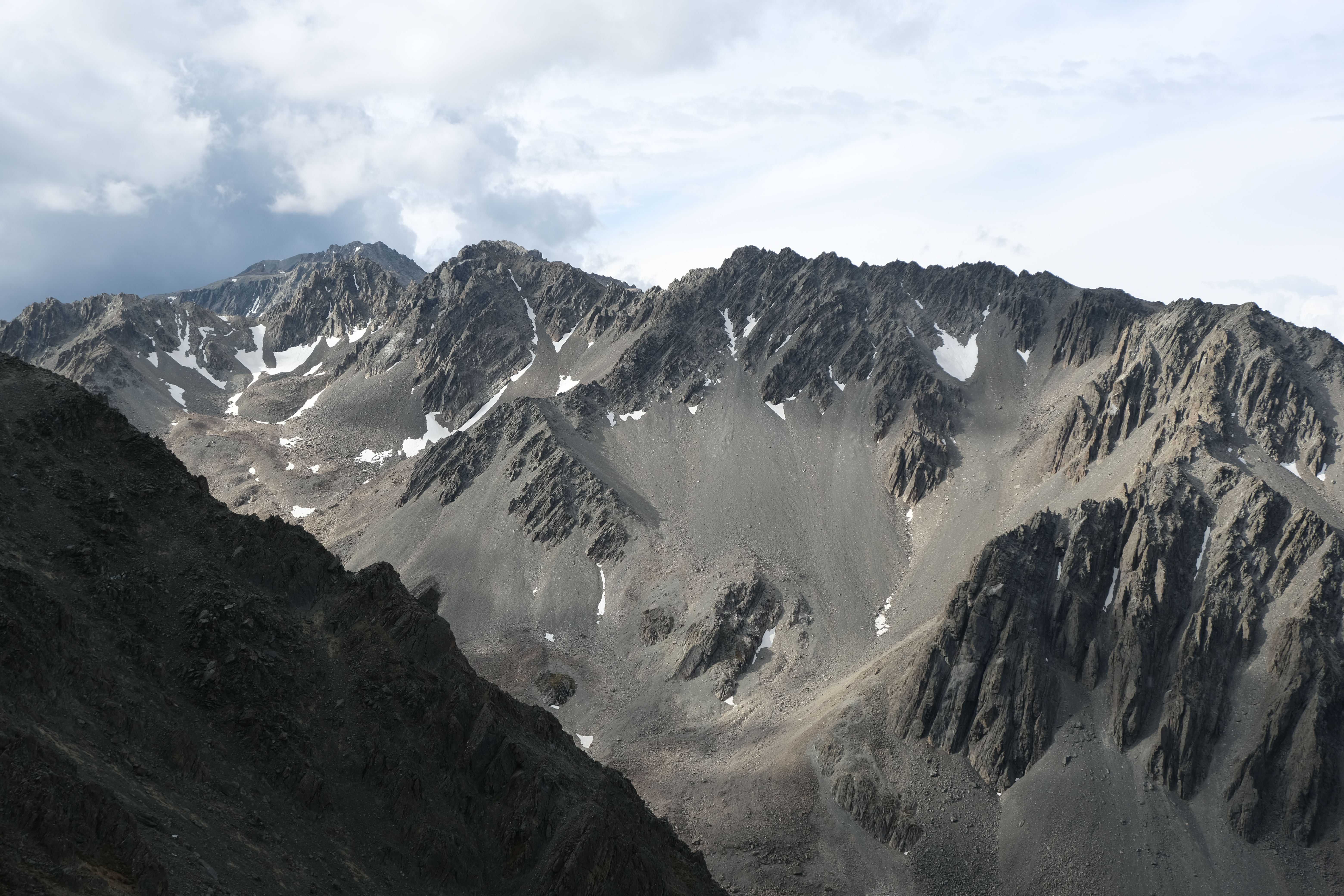 Initially following a GPX file supplied to me by Emily, who had snuck in a few months before me, I headed up an access track on public conservation land by Boundary stream. An initial attempt to head up Disappointment Gully ended in disappointment when I couldn’t get through a particularly gnarly patch of speargrass and matagauri. When I eventually reached scree it was quite hard going, both down and up. I opted to avoid it as much as possible on the climb and scrambled directly up a slightly more stable chossy gully instead, which forunately did lead to the ridge. I was briefly hit by a hail storm heading along to point 2023, but by the time I reached the summit the sun was out and I was sweating again.
