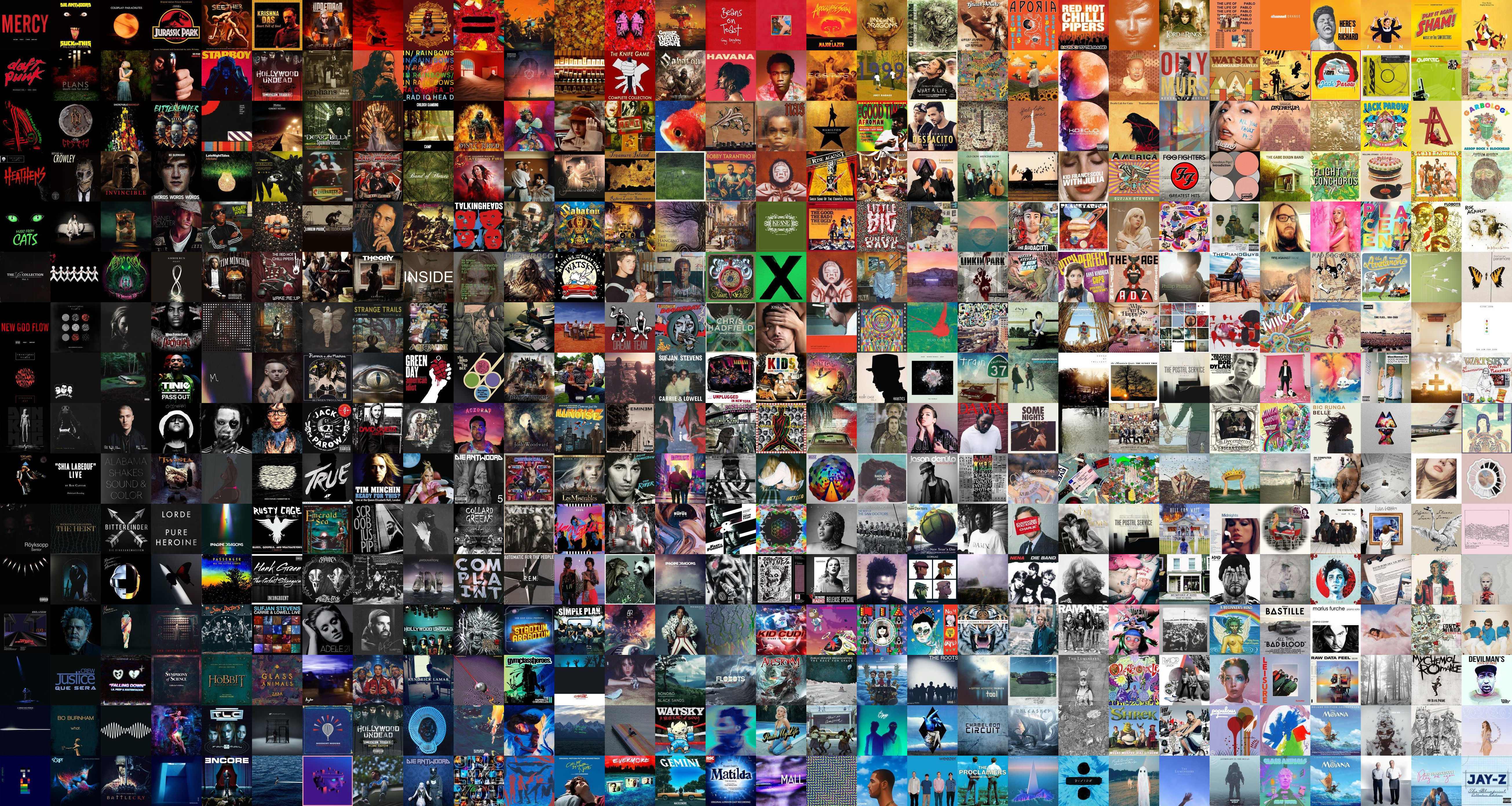 LCHColor space, and vertically using Z - (X+Y)/2 in the XYZColor space.DominantColors[] before I realised that ImageMeasurements[#, "Mean"]& actually gave me better results.I like the result. The ordering isn’t perfect, so I would like to revisit it at some point – either to commit to ordering the artworks manually, or improving on the way I coded it. But in the mean time this version has been printed and sits on my bedroom wall.