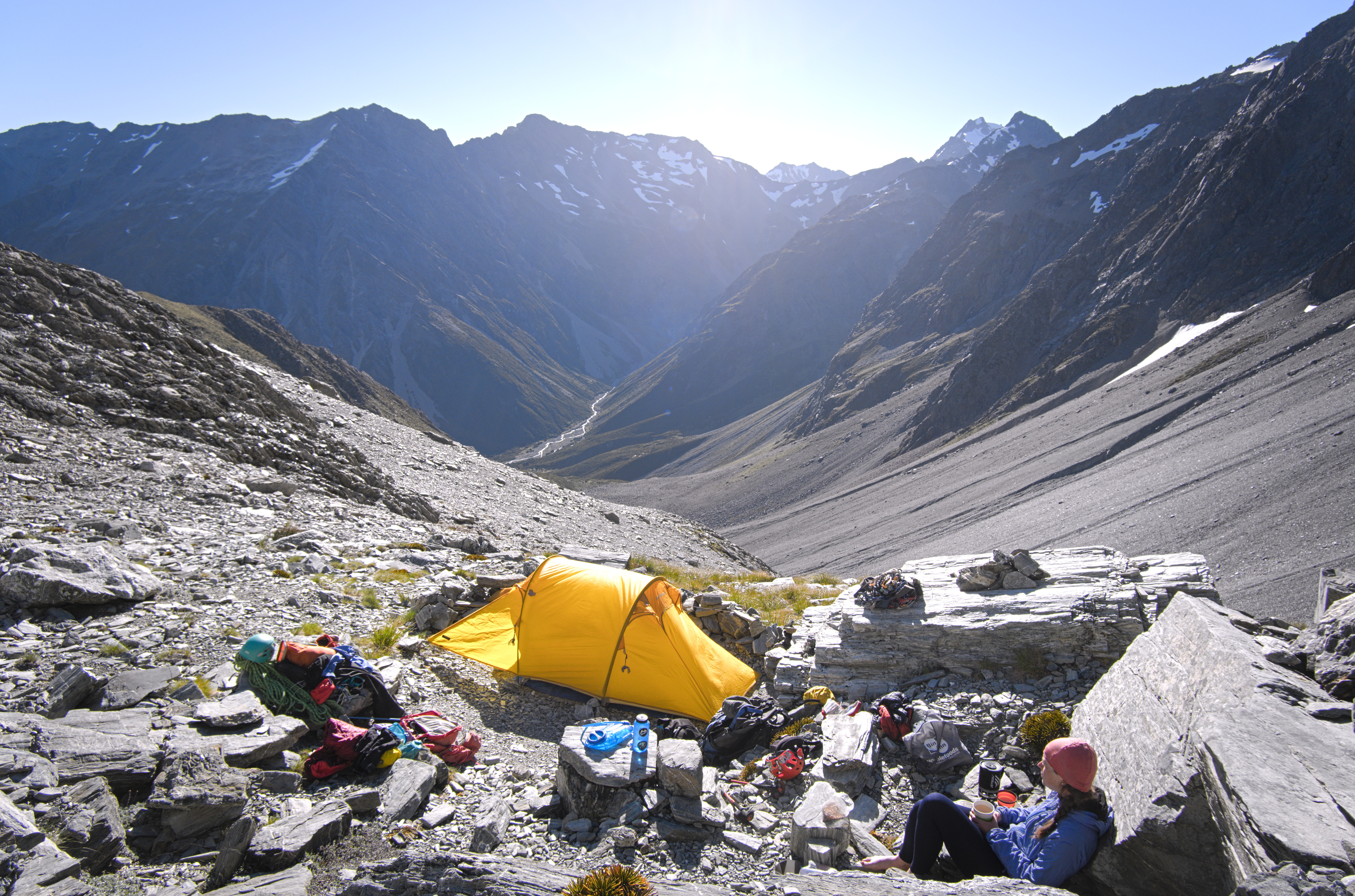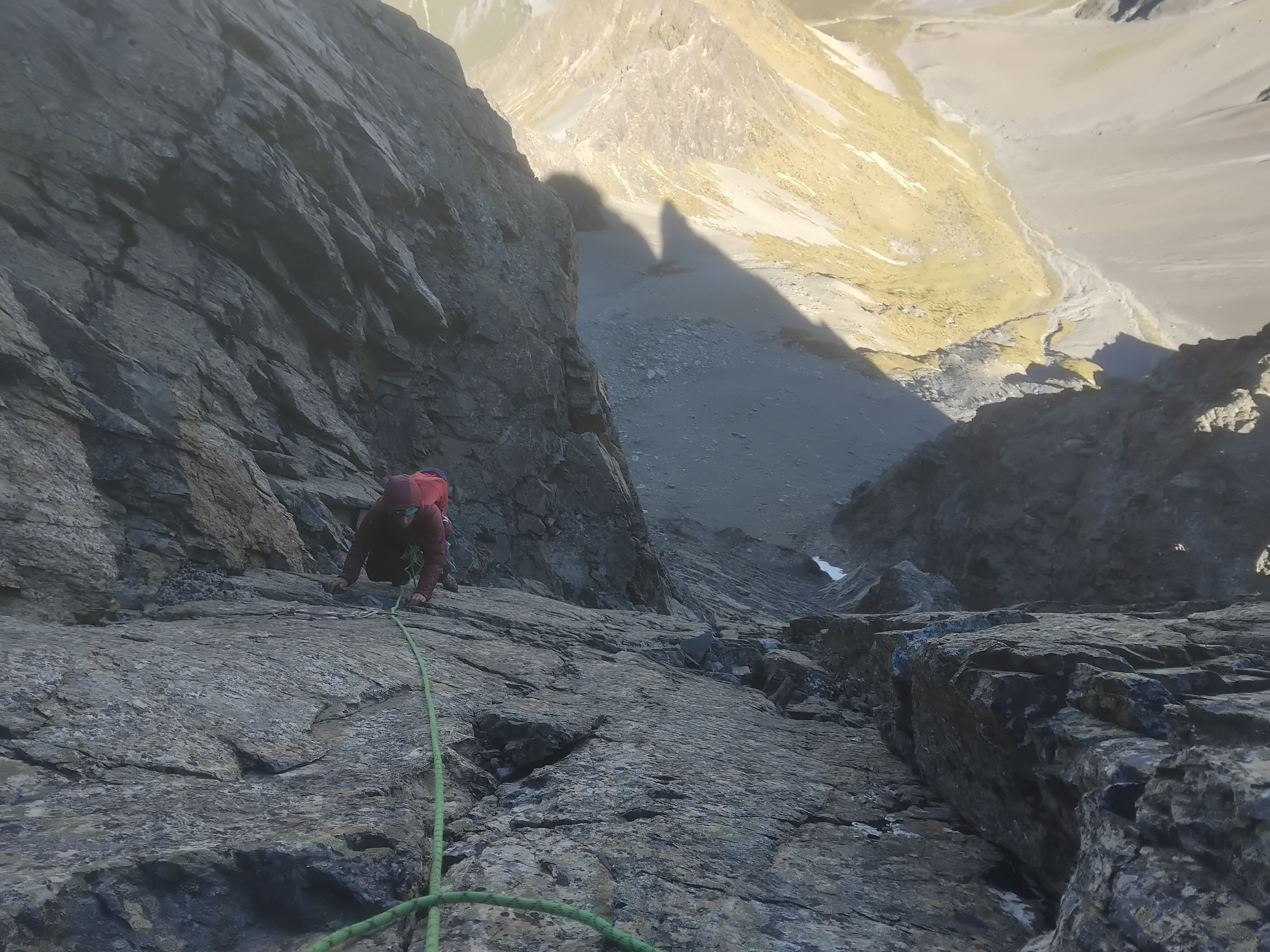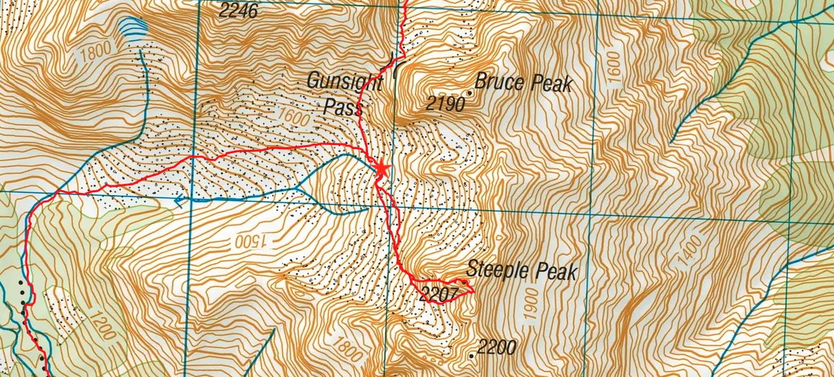 We walked in via the North Temple, camped at an established bivvy spot that night (on the 1700m contour; shown as a star on the route diagrams below). The next day we climbed Wēta Prowl, and walked out via the South Temple in the afternoon. Everyone seems to recommend doing the loop that direction, and I would agree. Climbing up to Gunsight pass from the North was fine, but would feel fairly sketchy going down.