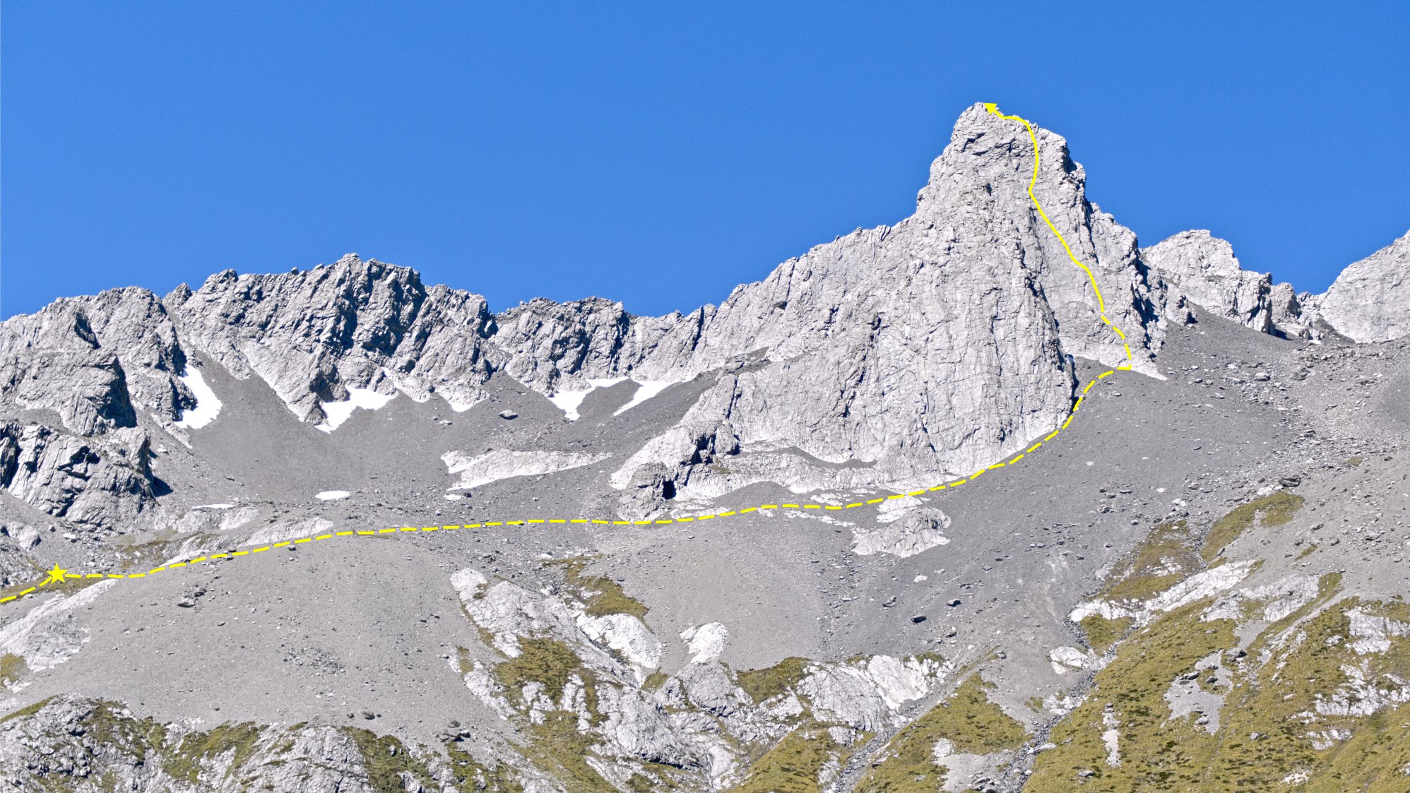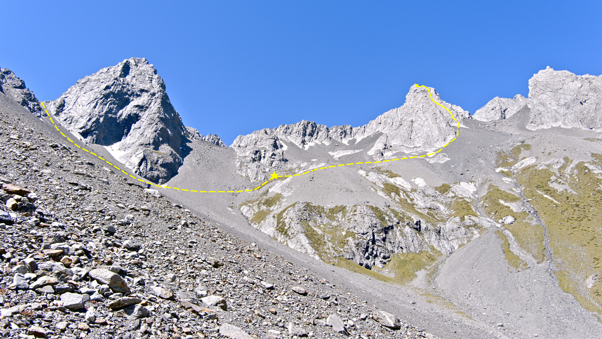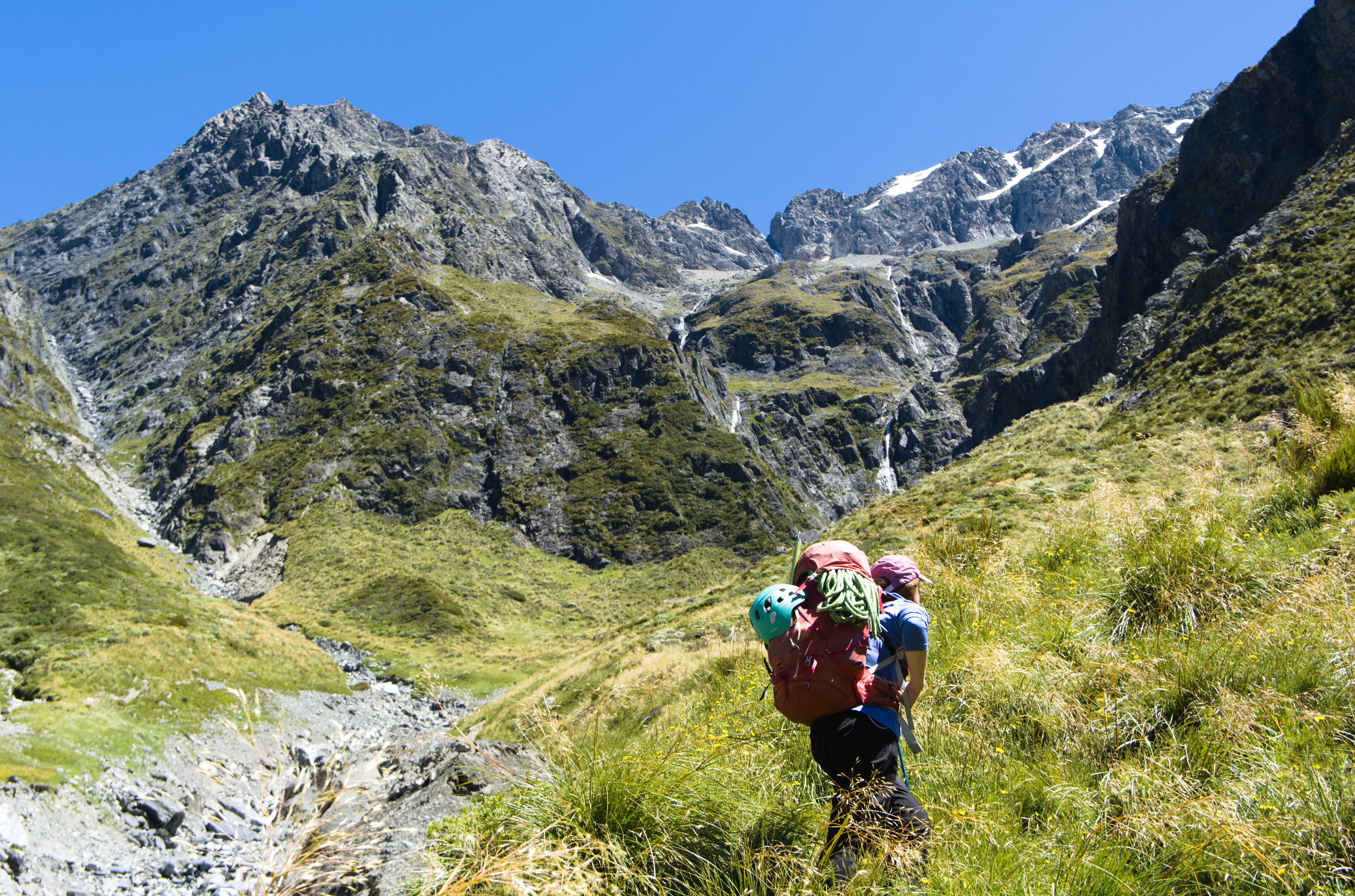 We walked in via the North Temple, camped at an established bivvy spot that night (on the 1700m contour; shown as a star on the route diagrams below). The next day we climbed Wēta Prowl, and walked out via the South Temple in the afternoon. Everyone seems to recommend doing the loop that direction, and I would agree. Climbing up to Gunsight pass from the North was fine, but would feel fairly sketchy going down.