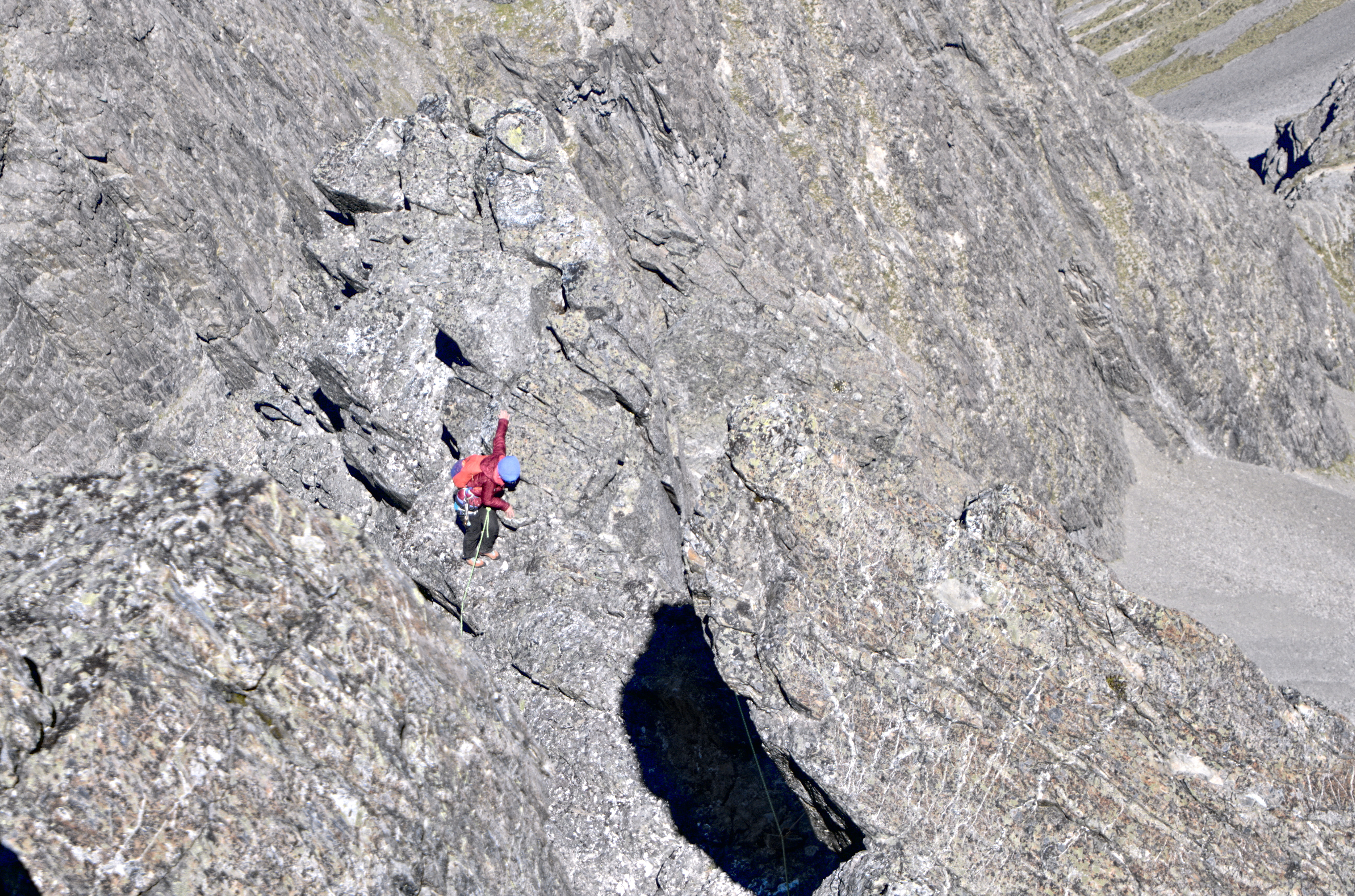 On the climb we soloed the first “pitch” (40m?), as seems to be common, which took us to a nice ledge where it was easy to rope up. From there it was 4 pitches up the face, essentially following the line of least resistance until building an anchor as close to a full rope length as possible. The first three pitches were nice and easy and I placed 3 pieces of gear on each. Mostly this was because I felt comfortable, although I also found there wasn’t as much of an abundance of good gear as I had been led to believe – and a few large features that moved! The fourth pitch had some crux 14 moves near the end, so I placed a little more. This took us to a nice little belay alcove. The remaining four pitches were essentially following the ridge, and mostly limited by rope drag. There were a few options and I made some choices which made it harder than it needed to be. On a couple of pitchecs I placed more gear to avoid big swings for me and my seconder. In the end the pitches probably ended up about (40m solo, 55m, 55m, 50m, 60m, 25m, 30m, 50m, 30m).